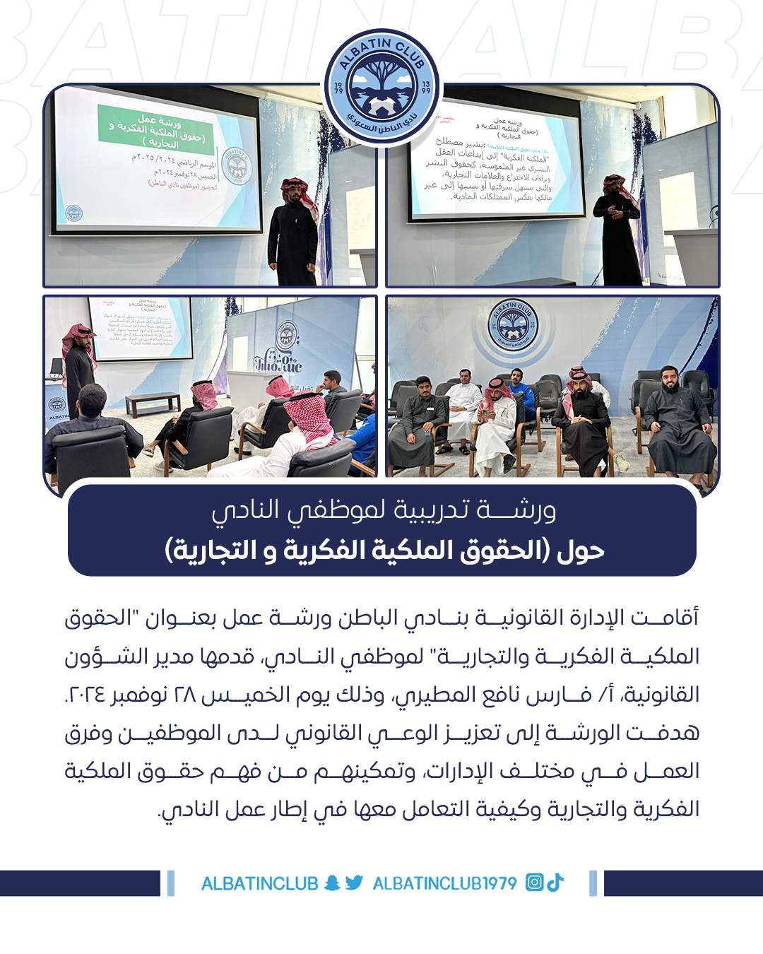 أقامت الإدارة القانونية بنادي الباطن ورشة عمل بعنوان “الحقوق الملكية الفكرية والتجارية” لموظفي النادي، قدمها مدير الشؤون القانونية، أ/ فارس نافع المطيري، وذلك يوم الخميس 28 نوفمبر 2024. هدفت الورشة إلى تعزيز الوعي القانوني لدى الموظفين وفرق العمل في مختلف الإدارات، وتمكينهم من فهم حقوق الملكية الفكرية والتجارية وكيفية التعامل معها في إطار عمل النادي.