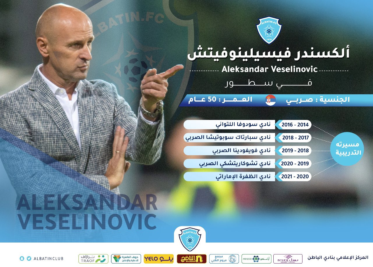 أعلن مجلس إدارة نادي الباطن برئاسة ناصر الهويدي، رسمياً عن وصول الصربي ألكسندر فيسيلينوفيتش، المدير الفني الجديد للفريق.