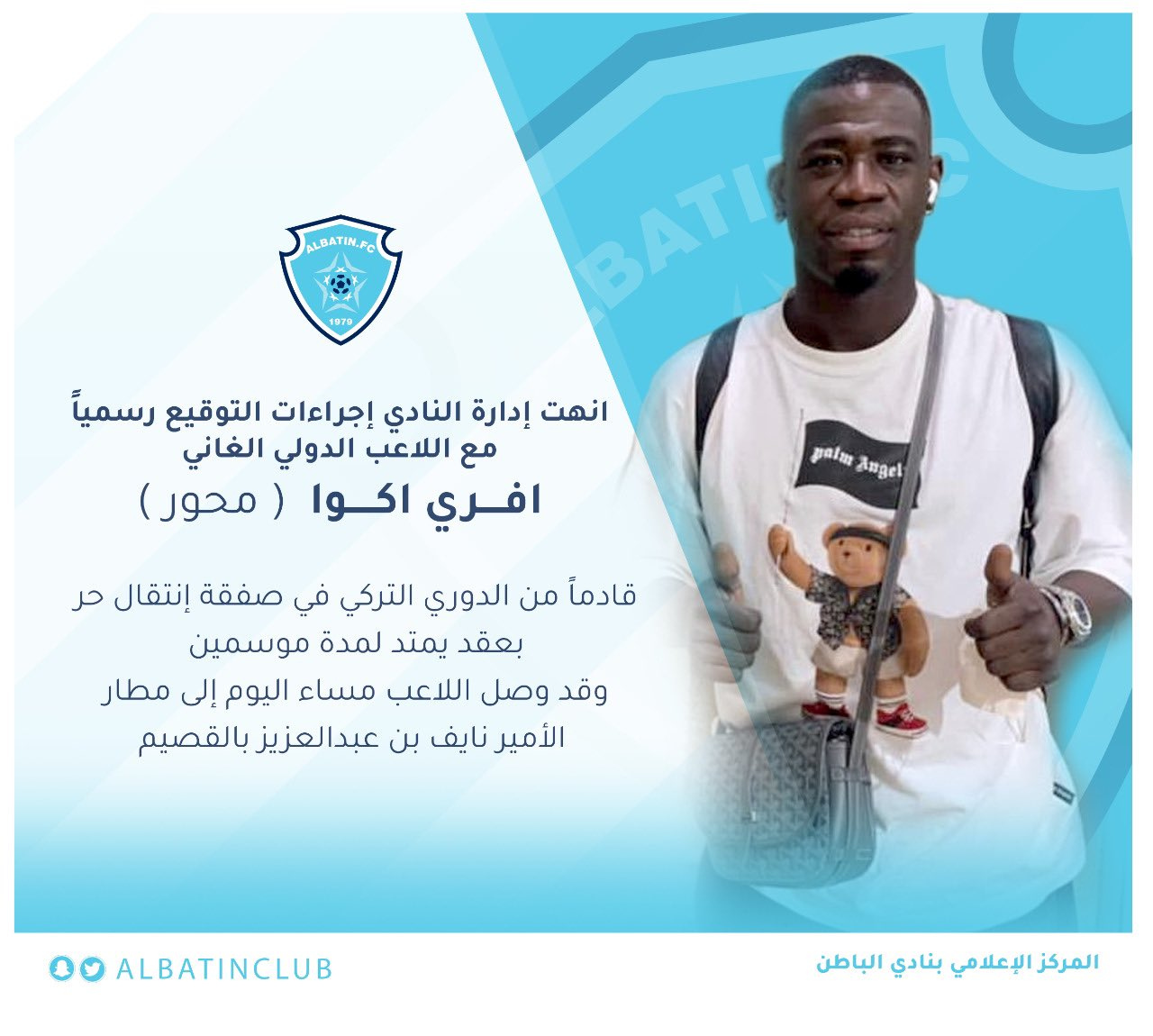أنهت إدارة النادي إجراءات التوقيع رسمياً مع الدولي الغاني افري اكوا (محور)