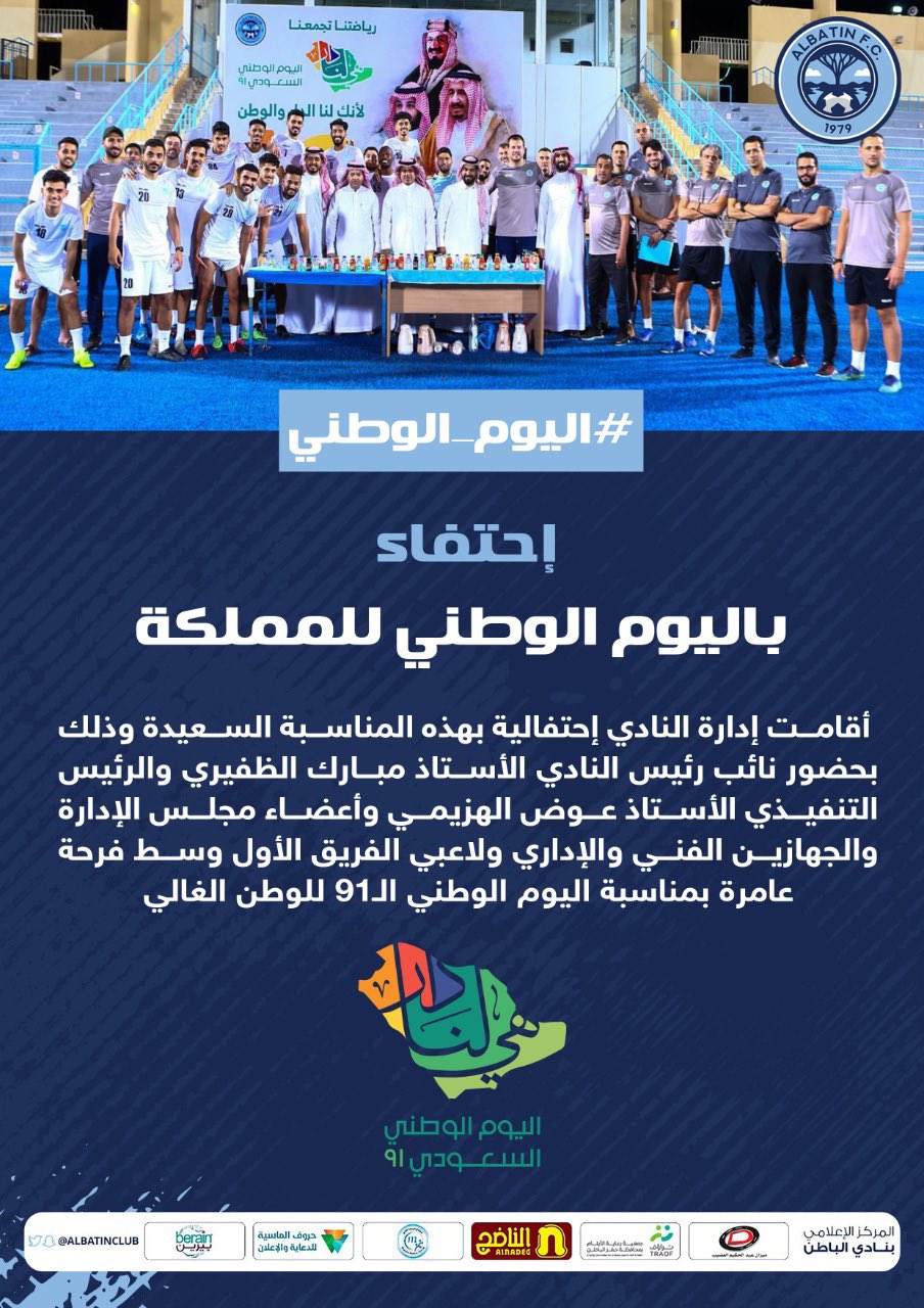 اقامت ادارة النادي احتفالية بهذه المناسبة السعيدة وذلك بحضور نائب رئيس النادي الاستاذ/مبارك الظفيري والرئيس التنفيذي/عوض الهزيمي واعضاء مجلس الادارة والجهازين الفني والاداري ولاعبي الفريق الأول وسط فرحة عامرة بمناسبة اليوم الوطني الـ91 للوطن الغالي.