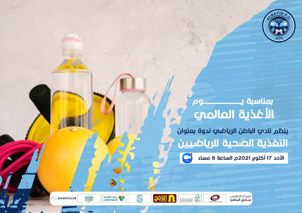رابط الدخول لـ ( الندوة العلمية التغذية الصحية للرياضيين )التي ينظمها نادي الباطن اليوم الاحد في تمام الساعة 8 مساءً بتوقيت مكة المكرمة رابط الدخول / https://us02web.zoom.us/j/85624013623 Meeting ID: 856 2401 3623 خلال فعاليات الندوة سيتم رفع رابط تسجيل للحضور الفعلي لإصدار شهاداتهم المعتمدة الباطن يقيم ندوة بعنوان التغذية الصحية للرياضيين.