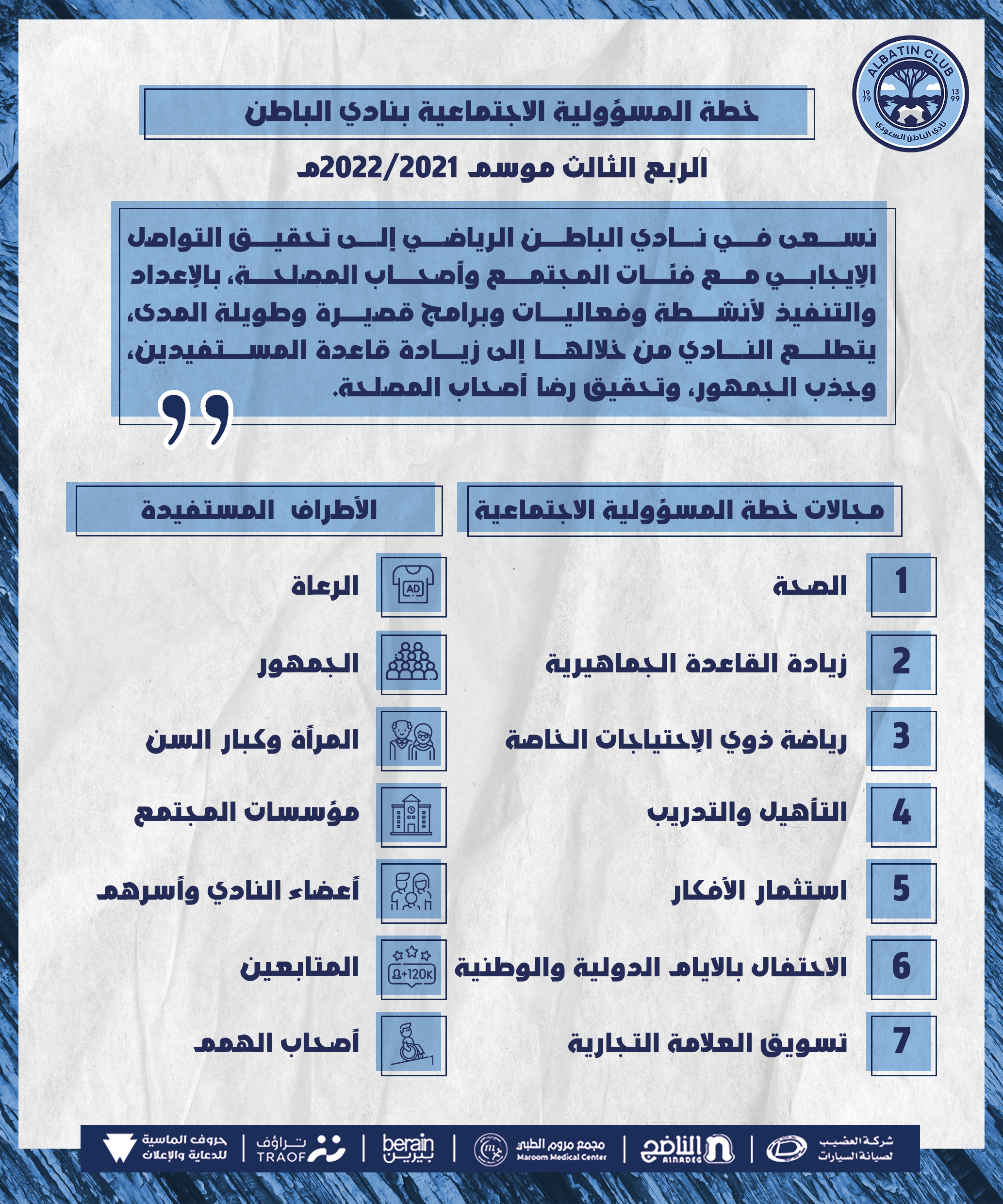 خطة المسؤولية الاجتماعية بنادي الباطن الربع الثالث موسم 2022/2021م 9 يناير، 2022 / المسؤولية الإجتماعية Share via: Facebook X (Twitter) LinkedIn More