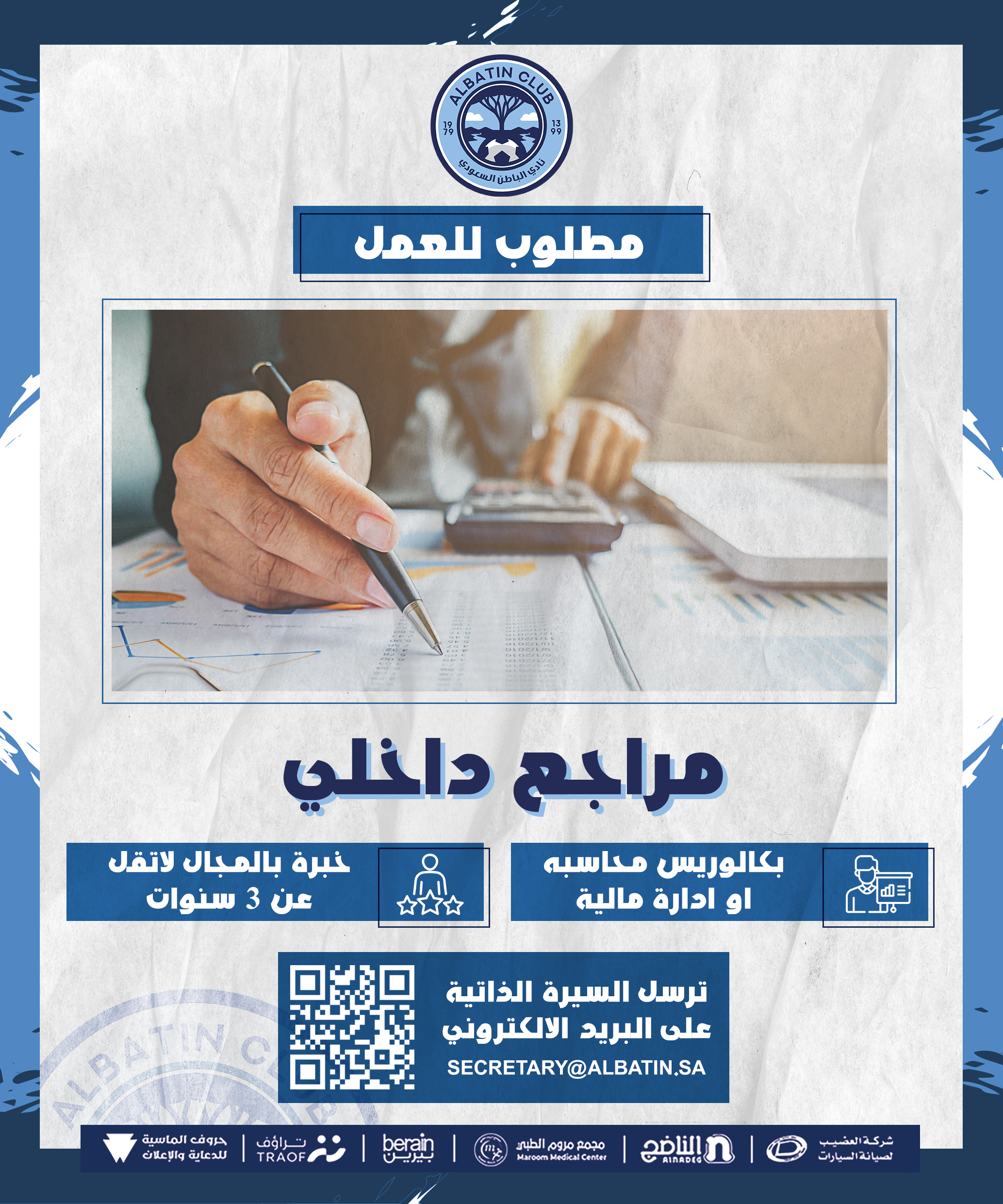 مطلوب للعمل مراجع داخلي 17 يناير، 2022 / اخبار النادي مراجع داخلي بكالوريس محاسبه او ادارة مالية خبرة بالمجال لاتقل عن 3 سنوات ترسل السيرة الذاتية على البريد الالكتروني Secretary@albatin.sa Share via: Facebook X (Twitter) LinkedIn More