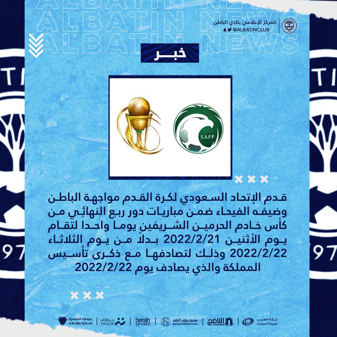 قدم الإتحاد السعودي لكرة القدم مواجهة الباطن وضيفه الفيحاء ضمن مباريات دور ربع النهائي من كأس خادم الحرمين الشريفين يوما واحدا لتقام يوم الأثنين 2022/2/21
