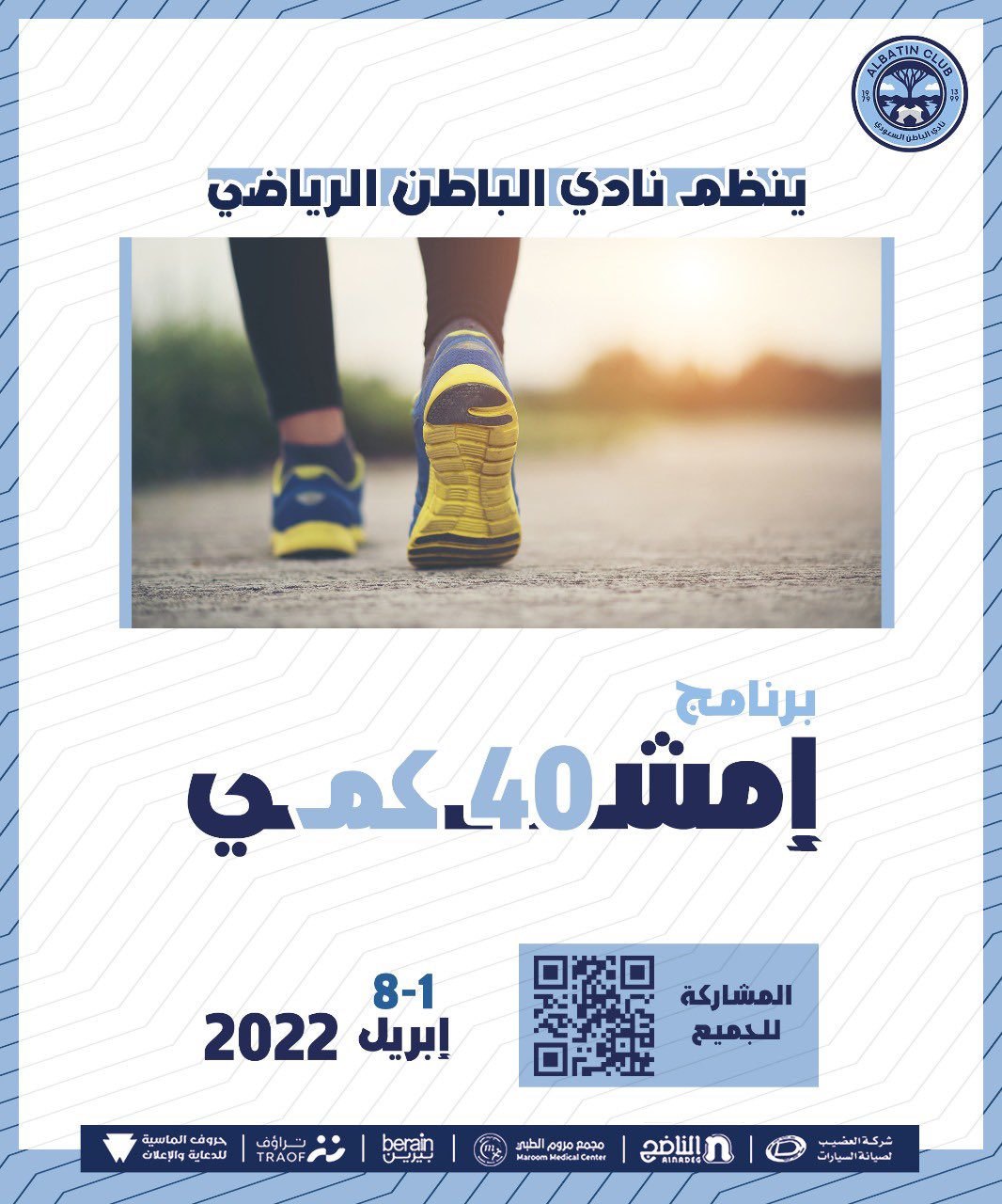 ينظم نادي الباطن وبرنامج أمشي 40 كم خلال أسبوع 30 مارس، 2022 / اخبار النادي, المسؤولية الإجتماعية 8-1 إبريل 2022م للإشتراك والتسجيل Share via: Facebook X (Twitter) LinkedIn More