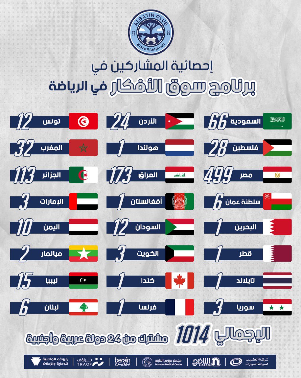 أطلقت إدارة المسؤولية الاجتماعية برنامجها المستحدث (سوق الأفكار في الرياضة) منذ أكتوبر 2021م، ومرفق إحصائية المشاركين في البرنامج حسب الدول، إحصائية الأفراد المشاركين بمشروعات حسب الدول، إحصائية المشروعات التي استقبلها البرنامج حسب مجالات التنافس ..وتم تحكيمهم من قبل لجان متخصصة