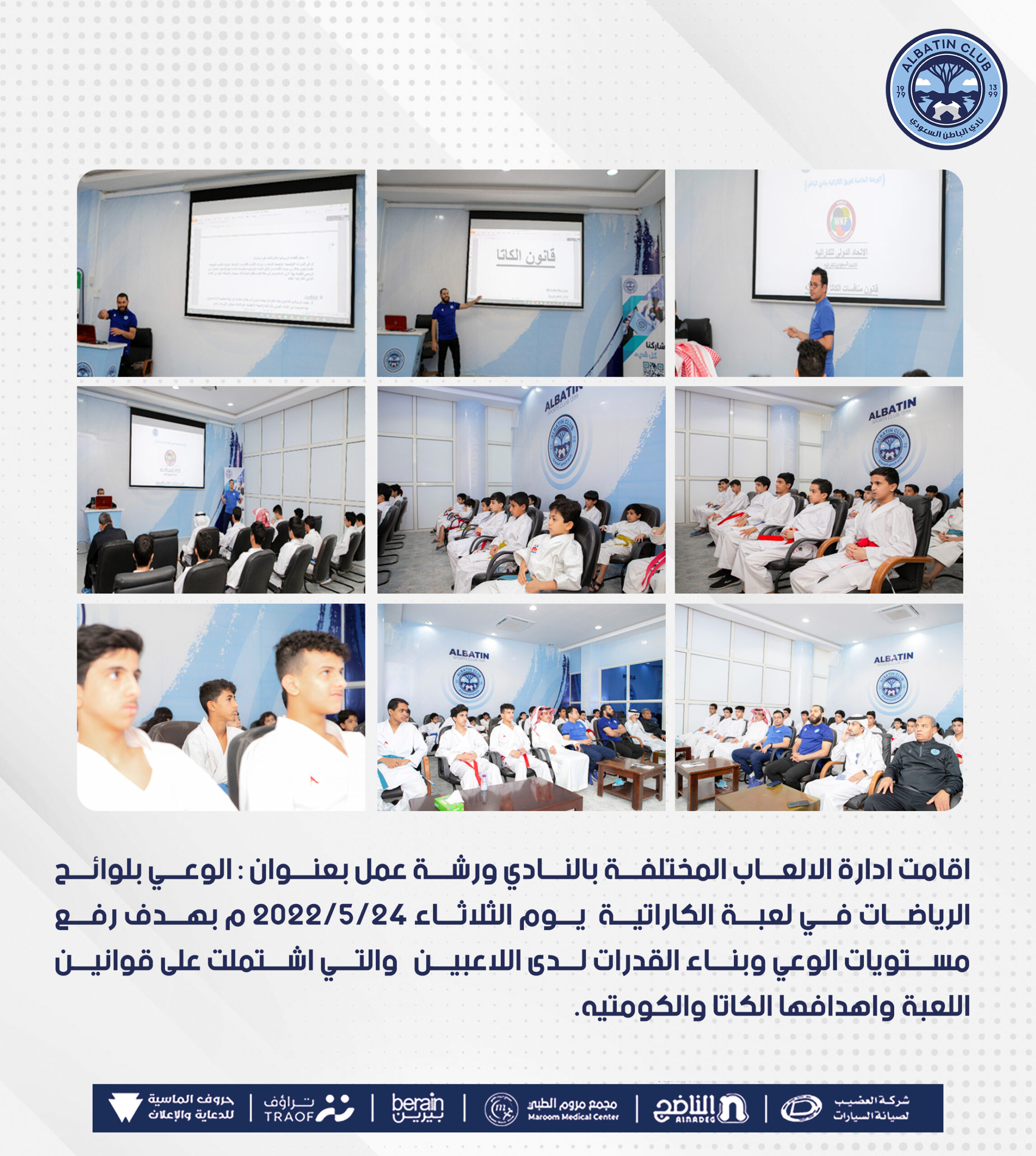 اقامت ادارة الالعاب المختلفة بالنادي ورشة عمل بعنوان : الوعي بلوائح الرياضات في لعبة الكاراتية يوم الثلاثاء 24/5/2022 م بهدف رفع مستوىات الوعي وبناء القدرات لدى اللاعبين والتي اشتملت على قوانين اللعبة واهدافها الكاتا والكومتيه.