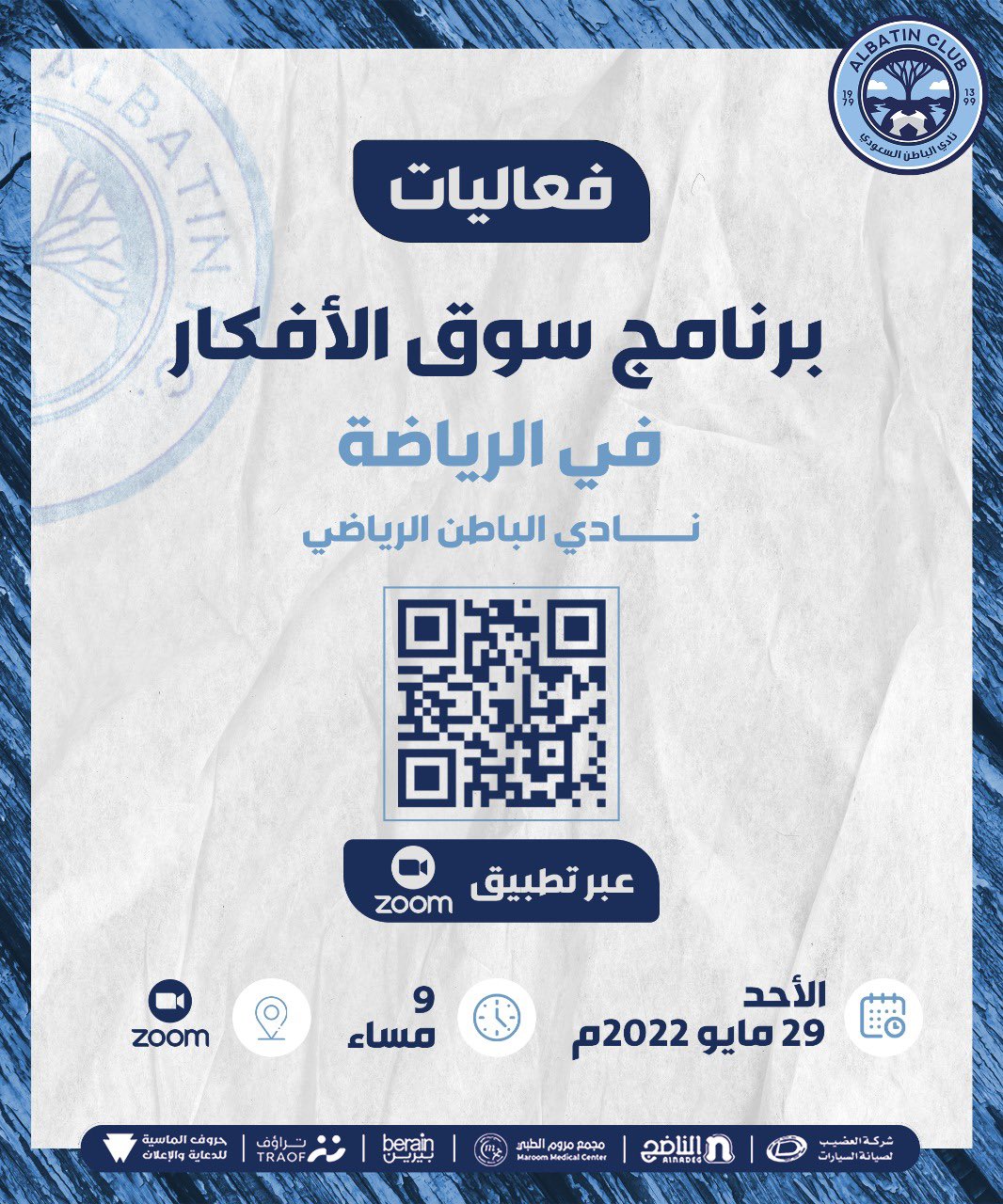 ندعوكم اليوم بمشيئة الله تعالى الأحد الموافق 29 مايو 2022م الساعة 9 مساءً بتوقيت مكة المكرمة لحضور فعاليات : برنامج سوق الأفكار في الرياضة سوف يتم إرسال شهادة حضور (عربي / انجليزي) لجميع المشاركين