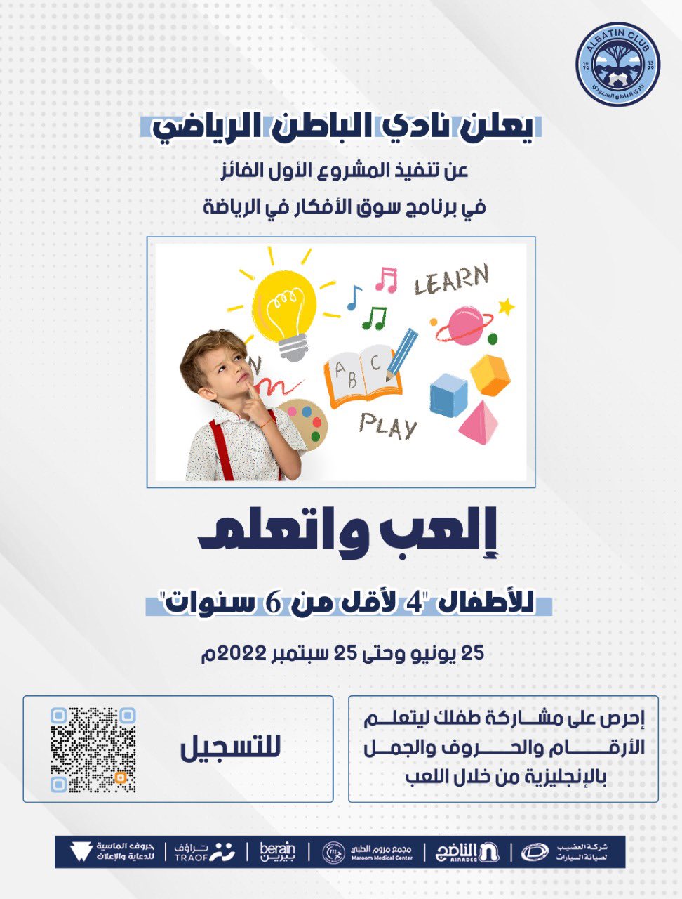 انطلاق برنامج (إلعب واتعلم) للأطفال في عمر قبل المدرسة 24 يونيو، 2022 / اخبار النادي, المسؤولية الإجتماعية تعلن ادارة المسؤولية الاجتماعية بالنادي عن انطلاق برنامج (إلعب واتعلم) للأطفال في عمر قبل المدرسة … الاشتراك لأول ١٠ أطفال للاشتراك Share via: Facebook X (Twitter) LinkedIn More