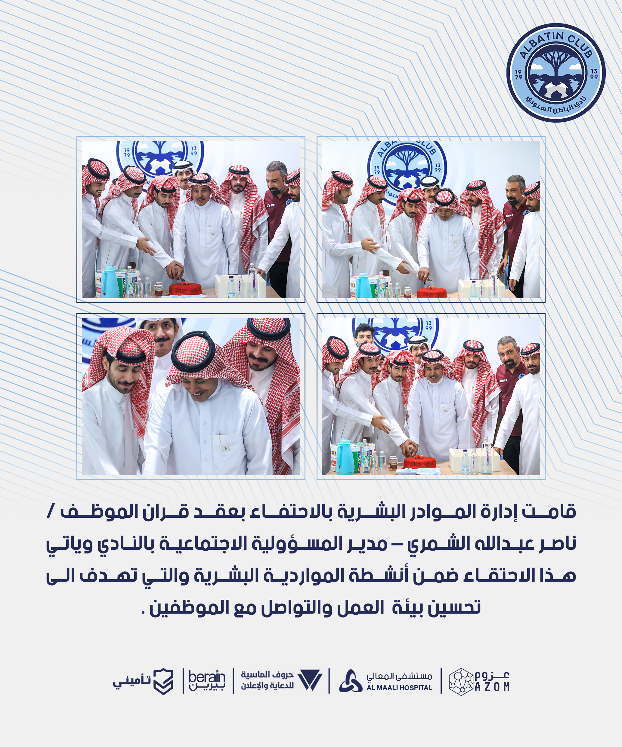قامت إدارة الموادر البشرية بالاحتفاء بعقد قران الموظف / ناصر عبدالله الشمري – مدير المسؤولية الاجتماعية بالنادي وياتي هذا الاحتقاء ضمن أنشطة المواردية البشرية والتلي تهدف الى تحسين بيئة العمل والتواصل مع الموظفين .
