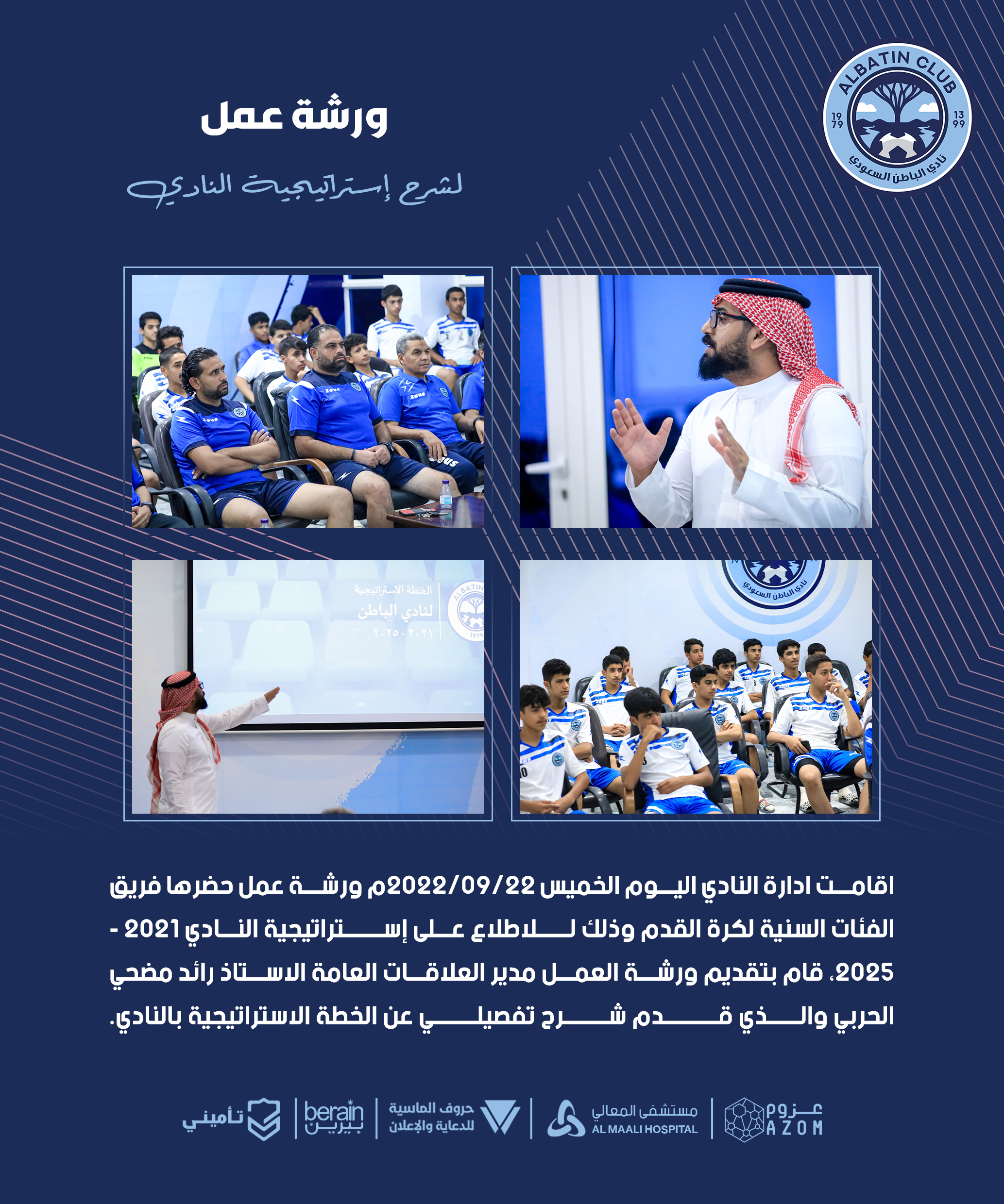 اقامت ادارة النادي اليوم الخميس 2022/09/22م ورشة عمل حضرها فريق الفئات السنية لكرة القدم وذلك لـــلاطلاع عـــلى إســــتراتيجية النـــادي 2021 – 2025، قام بتقديم ورشة العمل مدير العلاقات العامة الاستاذ رائد مضحي الحربي والـــذي قـــــــدم شـــــرح تفصيلـــــي عن الخطة الاستراتيجية بالنادي.