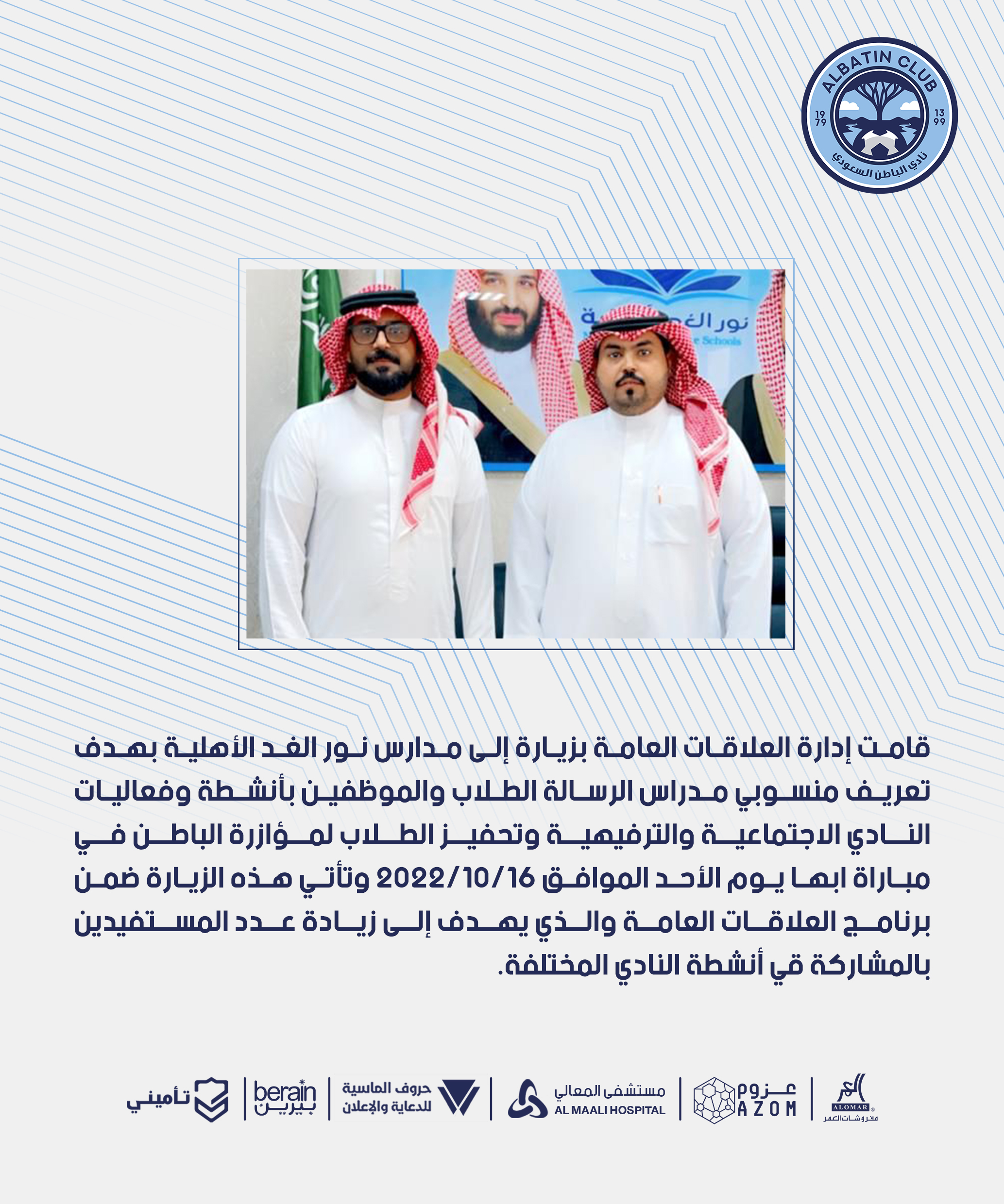 قامت إدارة العلاقات العامة بزيارة إلى مدارس نور الغد الأهلية بهدف تعريف منسوبي مدراس الرسالة الطلاب والموظفين بأنشطة وفعاليات النادي الاجتماعية والترفيهية وتحفيز الطلاب لمؤازرة الباطن في مباراة ابها يوم الأحد الموافق 2022/10/16 وتأتي هذه الزيارة ضمن برنامج العلاقات العامة والذي يهدف إلى زيادة عدد المستفيدين بالمشاركة قي أنشطة النادي المختلفة.