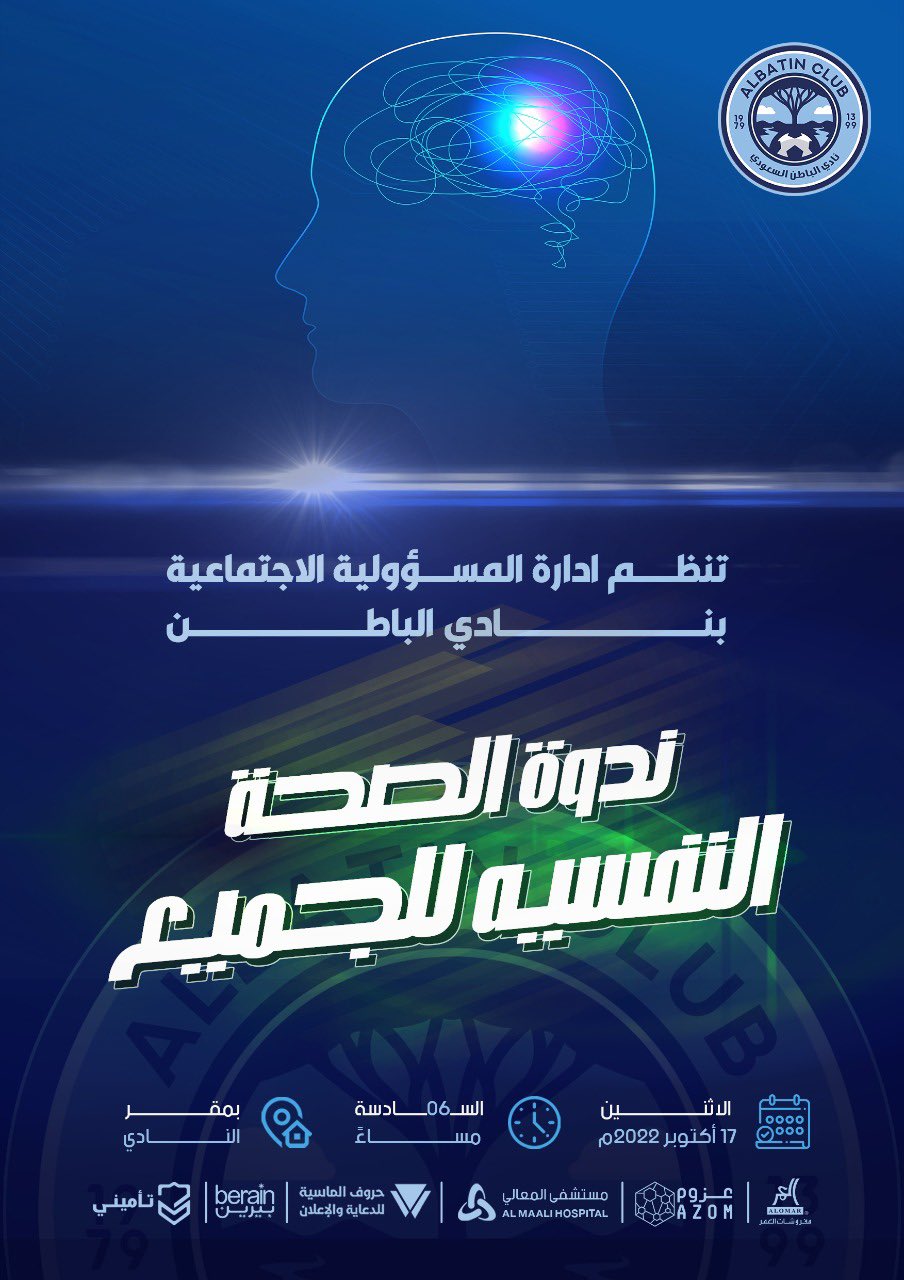 بالتزامن مع الاحتفالات العالمية بالصحة النفسية – تنظم إدارة المسؤولية الاجتماعية بنادي #الباطن ندوة (الصحة النفسية للجميع) والتي تستهدف الأفراد + 18 سنة والرياضيين.