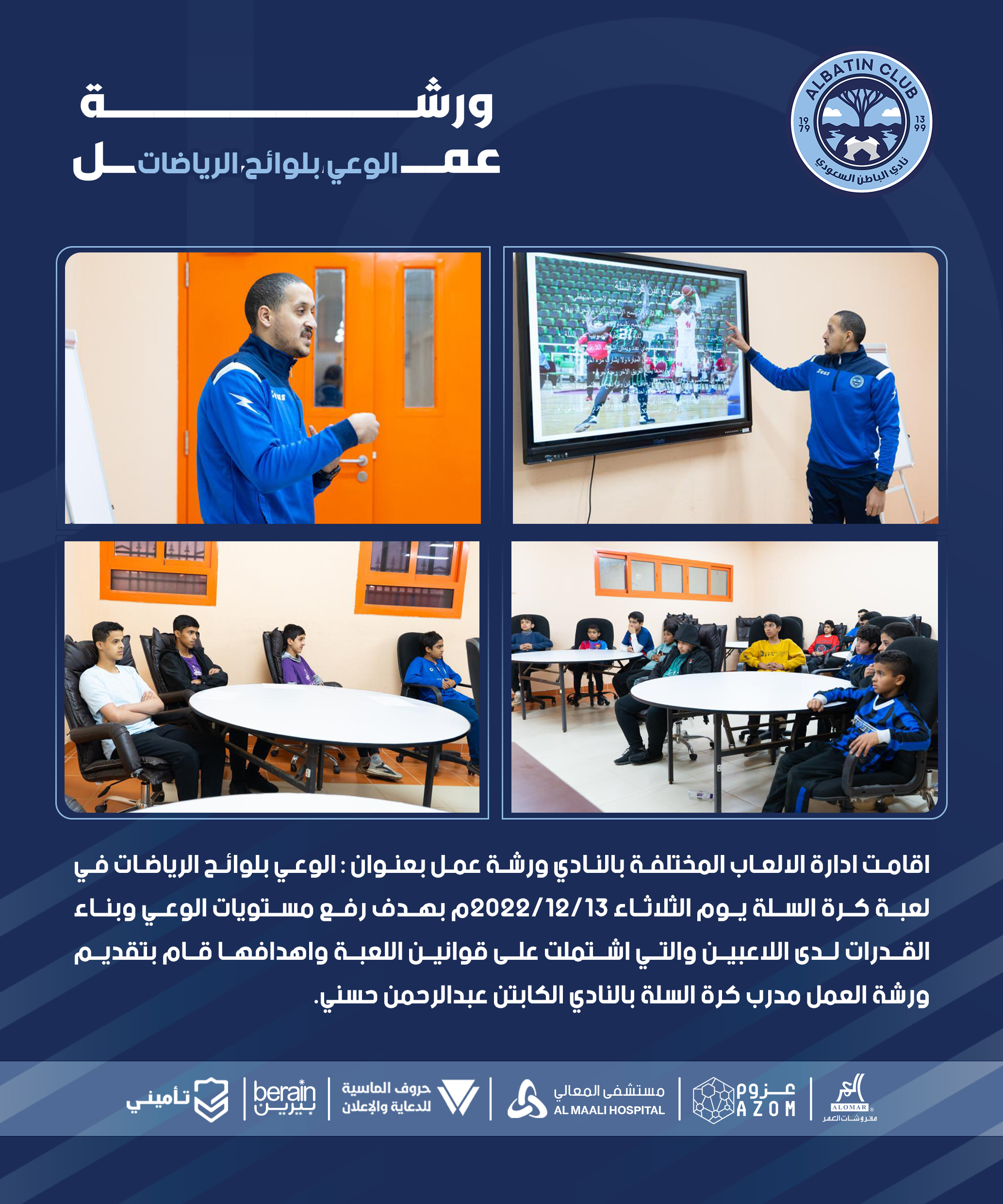 اقامت ادارة الالعاب المختلفة بالنادي ورشة عمل بعنوان : الوعي بلوائح الرياضات في لعبة كرة السلة يوم الثلاثاء 2022/12/13م بهدف رفع مستويات الوعي وبناء القدرات لدى اللاعبين والتي اشتملت على قوانين اللعبة واهدافها قام بتقديم ورشة العمل مدرب كرة السلة بالنادي الكابتن عبدالرحمن حسني.