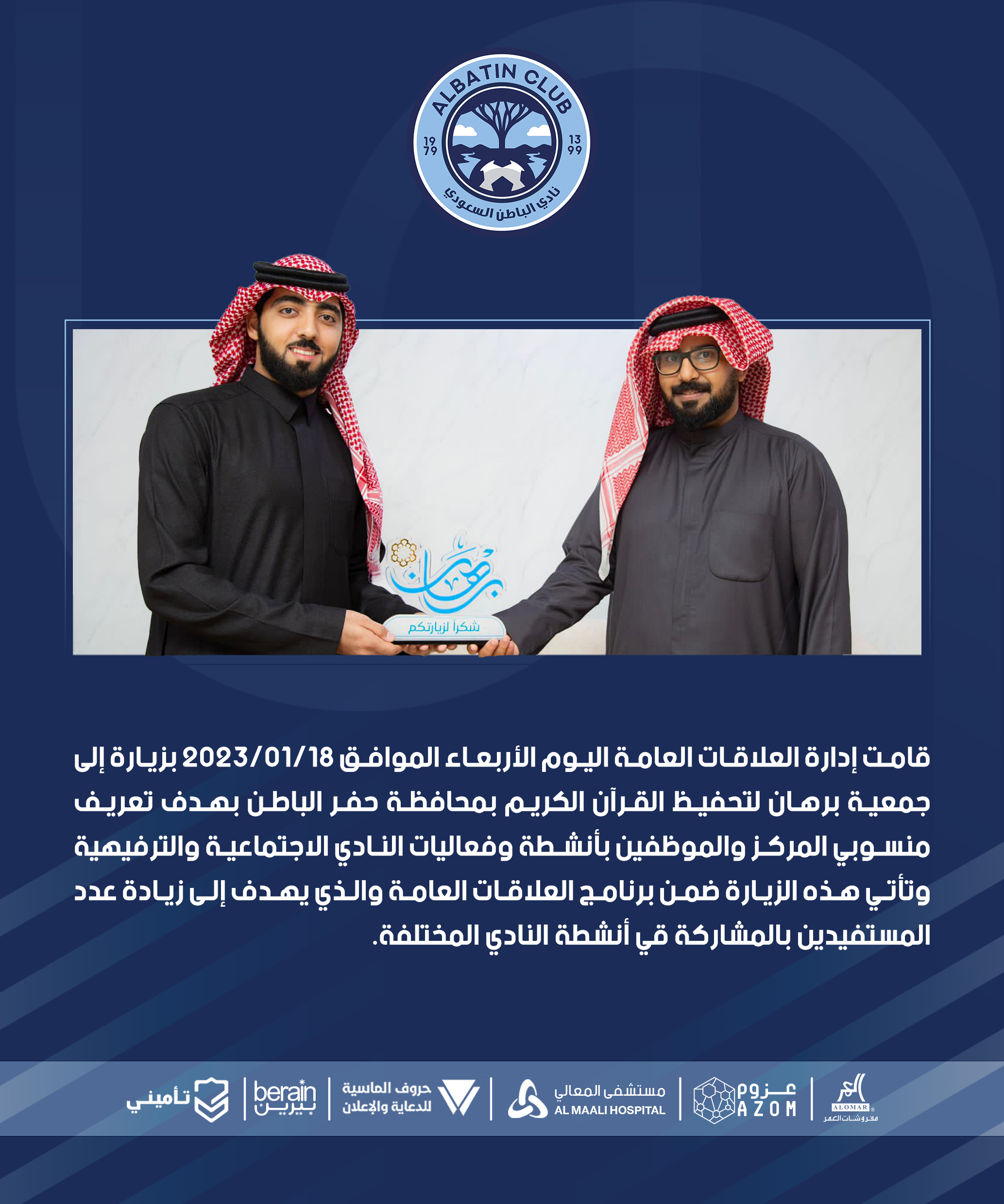 قامت إدارة العلاقات العامة اليوم الأربعاء الموافق 2023/01/18 بزيارة إلى جمعية برهان لتحفيظ القرآن الكريم بمحافظة حفر الباطن بهدف تعريف منسوبي المركز والموظفين بأنشطة وفعاليات النادي الاجتماعية والترفيهية وتأتي هذه الزيارة ضمن برنامج العلاقات العامة والذي يهدف إلى زيادة عدد المستفيدين بالمشاركة قي أنشطة النادي المختلفة.