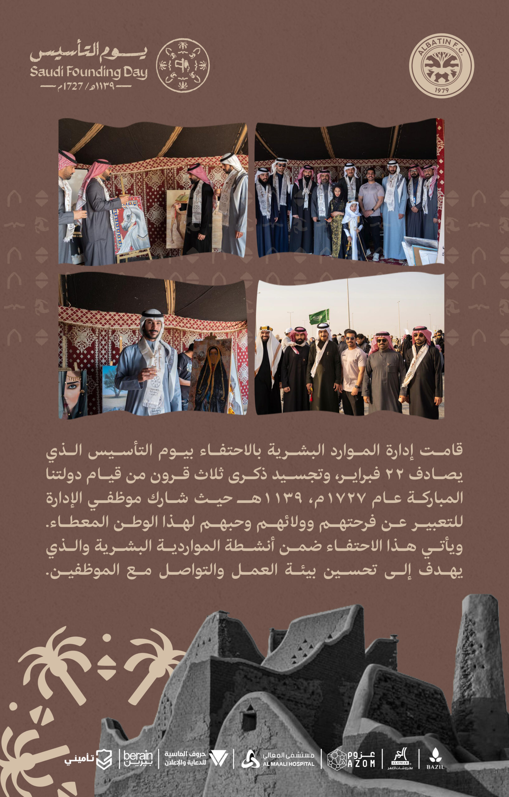 قامت إدارة الموارد البشرية بالاحتفاء بيوم التأسيس الذي يصادف 22 فبراير، وتجسيد ذكرى ثلاث قرون من قيام دولتنا المباركة عام 1727م، 1139هـ حيث شارك موظفي الإدارة لتعبير عن فرحتهم وولاءهم وحبهم لهذا الوطن المعطاء.