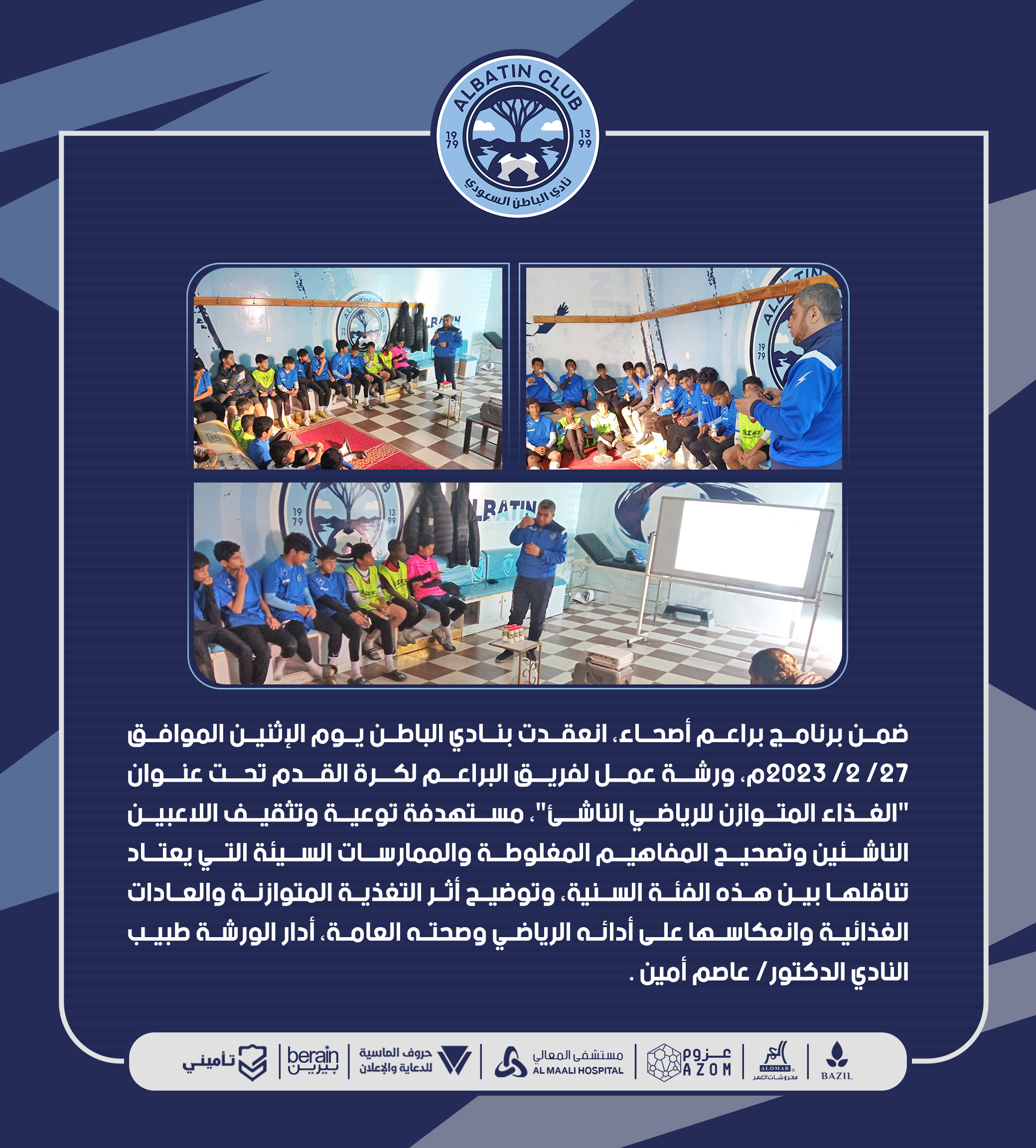 انعقدت بنادي الباطن يوم الإثنين الموافق 27/ 2/ 2023م، ورشة عمل لفريق البراعم لكرة القدم تحت عنوان “الغذاء المتوازن للرياضي الناشئ”، مستهدفة توعية وتثقيف اللاعبين الناشئين وتصحيح المفاهيم المغلوطة والممارسات السيئة التي يعتاد تناقلها بين هذه الفئة السنية، وتوضيح أثر التغذية المتوازنة والعادات الغذائية وانعكاسها على أدائه الرياضي وصحته العامة، أدار الورشة طبيب النادي الدكتور/ عاصم أمين .
