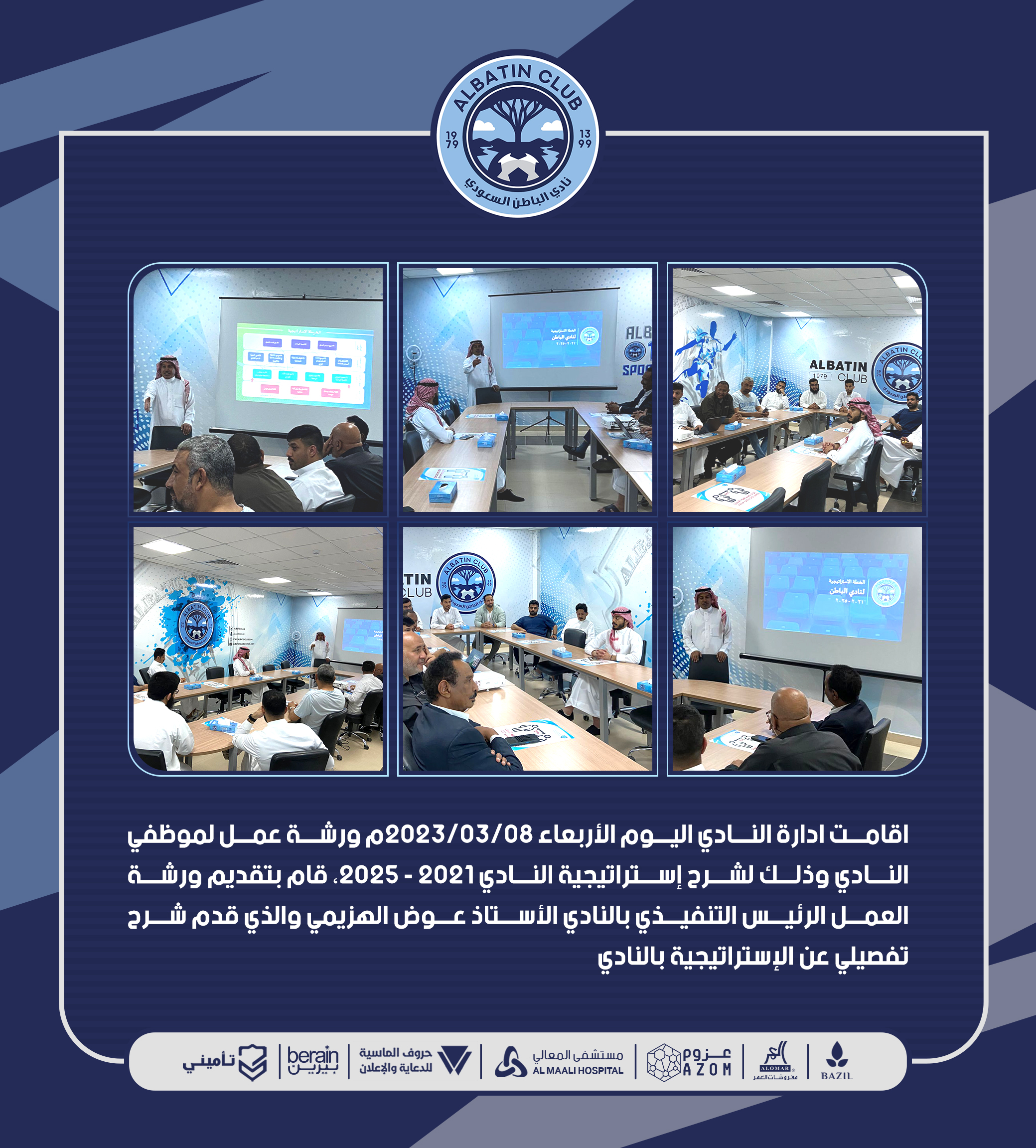 اقامت ادارة النادي اليوم الأربعاء 2023/03/08م ورشة عمل لموظفي النادي وذلك لشرح إستراتيجية النادي 2021 – 2025، قام بتقديم ورشة العمل الرئيس التنفيذي بالنادي الأستاذ عوض الهزيمي والذي قدم شرح تفصيلي عن الإستراتيجية بالنادي