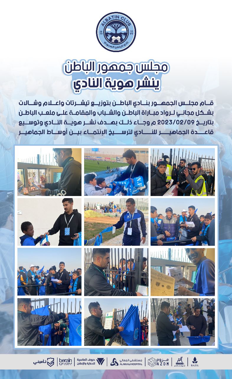 قام مجلس الجمهور بنادي الباطن بتوزيع تيشرتات واعلام وشالات بشكل مجاني لرواد مباراة الباطن والشباب والمقامة على ملعب الباطن بتاريخ 2023/02/09 م وجاء ذلك بهدف نشر هوية النادي وتوسيع قاعــدة الجماهيـــر للنـــادي لترســيخ الإنتماء بين أوساط الجماهير