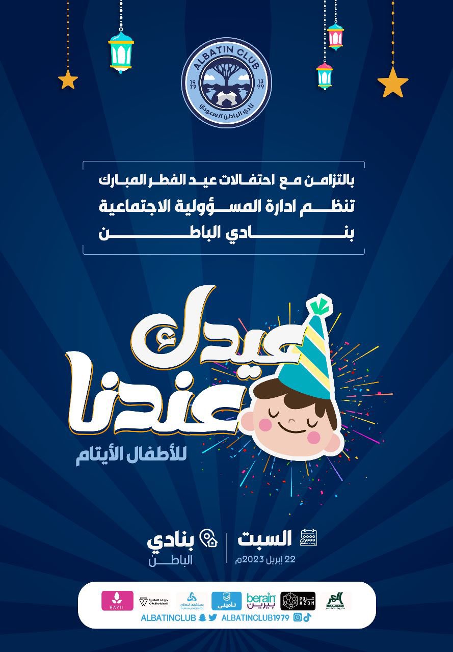 بالتزامن مع الاحتفال بعيد الفطر المبارك 2023م تنظم إدارة المسؤولية الاجتماعية بنادي #الباطن فعالية ترفيهية للأطفال الأيتام بعنوان (عيدك عندنا) وكل عام والجميع بألف خير
