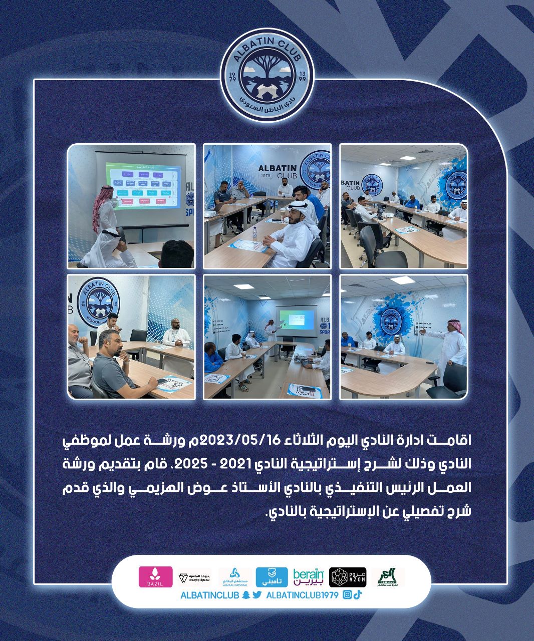 اقامت ادارة النادي اليوم الثلاثاء 2023/05/16م ورشة عمل لموظفي النادي وذلك لشرح إستراتيجية النادي 2021 – 2025، قام بتقديم ورشة العمل الرئيس التنفيذي بالنادي الأستاذ عوض الهزيمي والذي قدم شرح تفصيلي عن الإستراتيجية بالنادي.