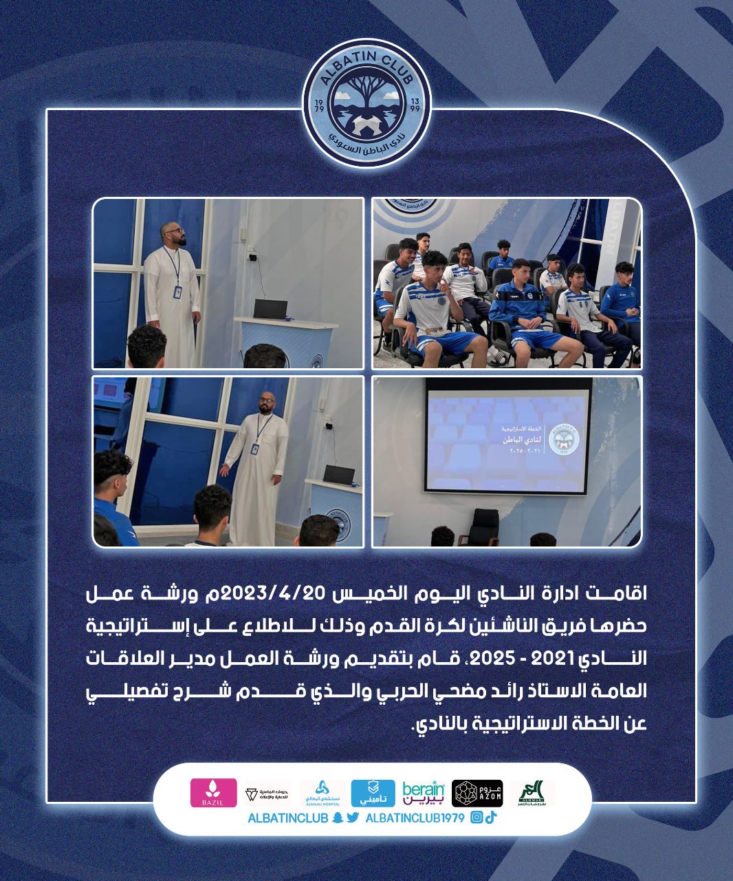 اقامت ادارة النادي اليوم الخميس 2023/4/20م ورشة عمل حضرها فريق الناشئين لكرة القدم وذلك لـــلاطلاع عـــلى إســــتراتيجية النـــادي 2021 – 2025، قام بتقديم ورشة العمل مدير العلاقات العامة الاستاذ رائد مضحي الحربي والـــذي قـــــــدم شـــــرح تفصيلـــــي عن الخطة الاستراتيجية بالنادي.