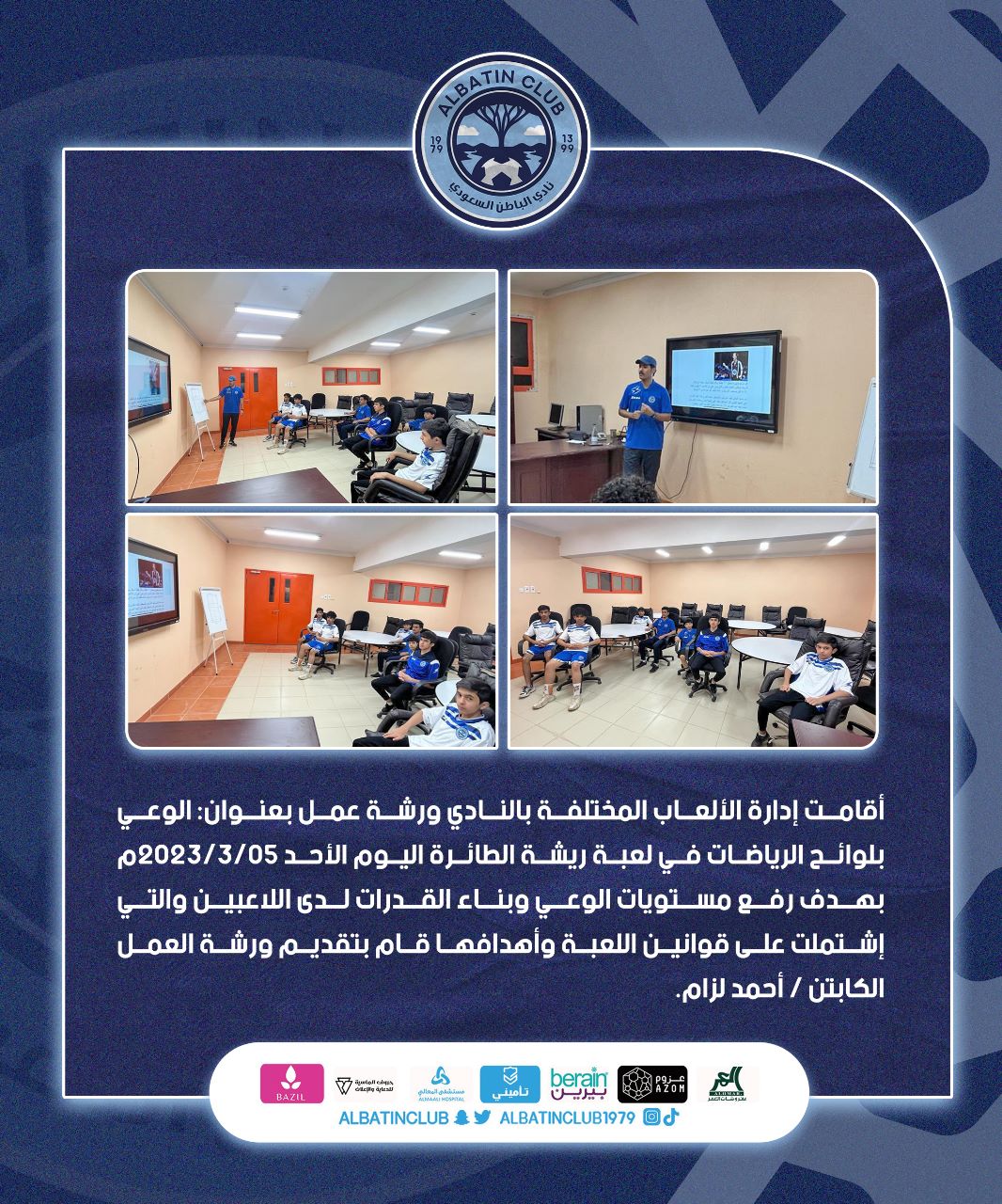 أقامت إدارة الألعاب المختلفة بالنادي ورشة عمل بعنوان: الوعي بلوائح الرياضات في لعبة ريشة الطائرة اليوم الأحد 2023/3/05م بهدف رفع مستويات الوعي وبناء القدرات لدى اللاعبين والتي إشتملت على قوانين اللعبة وأهدافها قام بتقديم ورشة العمل الكابتن / أحمد لزام.
