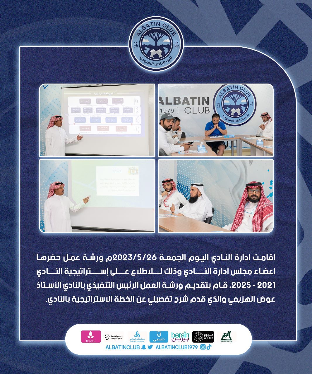اقامت ادارة النادي اليوم الجمعة 2023/5/26م ورشة عمل حضرها اعضاء مجلس ادارة النــــادي وذلك لـــلاطلاع عـــلى إســــتراتيجية النـــادي 2021 – 2025، قام بتقديم ورشة العمل الرئيس التنفيذي بالنادي الأستاذ عوض الهزيمي والذي قدم شرح تفصيلي عن الخطة الاستراتيجية بالنادي.