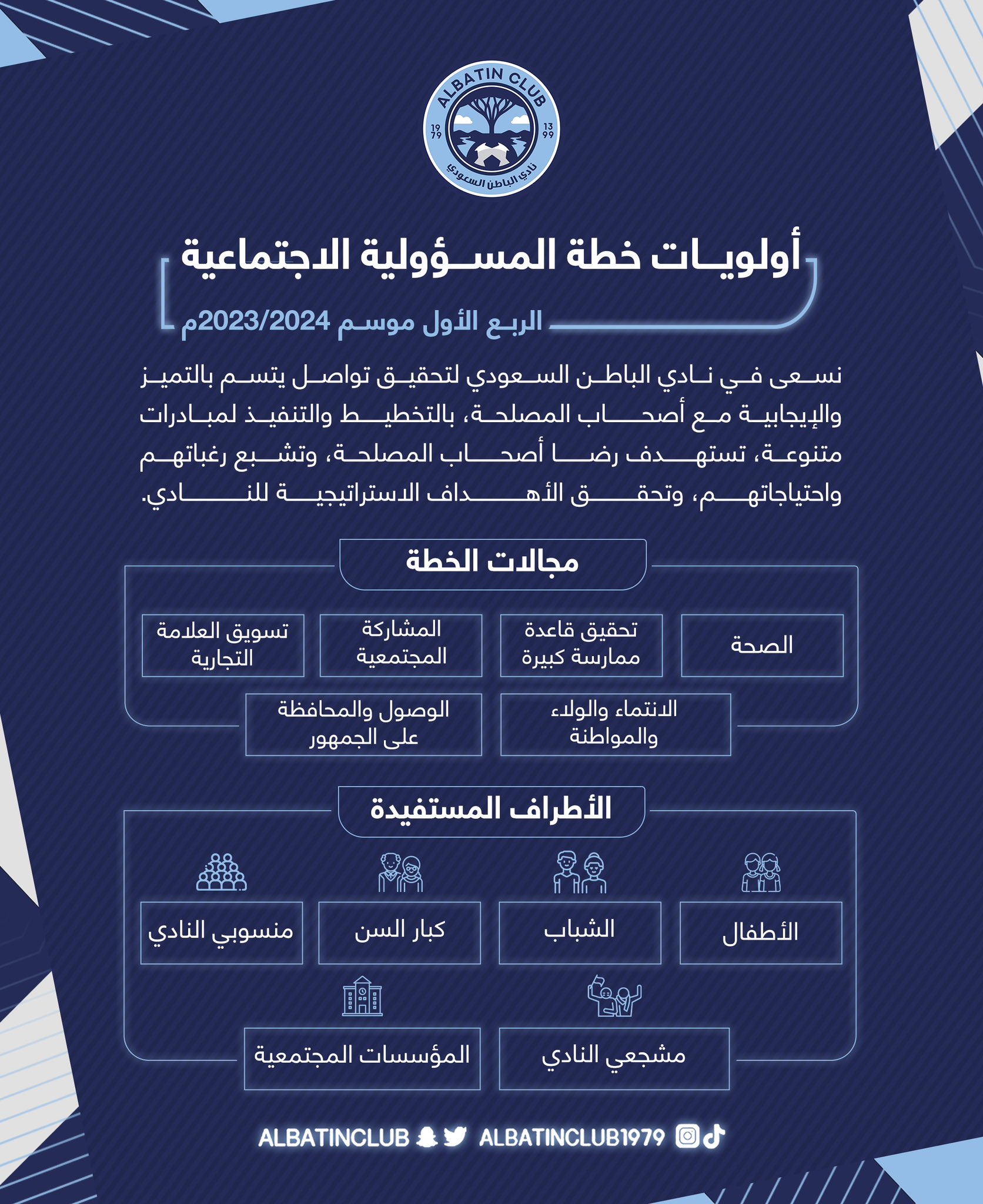 أولويات وخطة المسؤولية الإجتماعية بنادي الباطن ( الربع الأول – موسم ٢٠٢٣ – ٢٠٢٤ م ) 13 يوليو، 2023 / اخبار النادي, المسؤولية الإجتماعية أولويات وخطة المسؤولية الإجتماعية بنادي الباطن ( الربع الأول – موسم ٢٠٢٣ – ٢٠٢٤ م ) Share via: Facebook X (Twitter) LinkedIn More