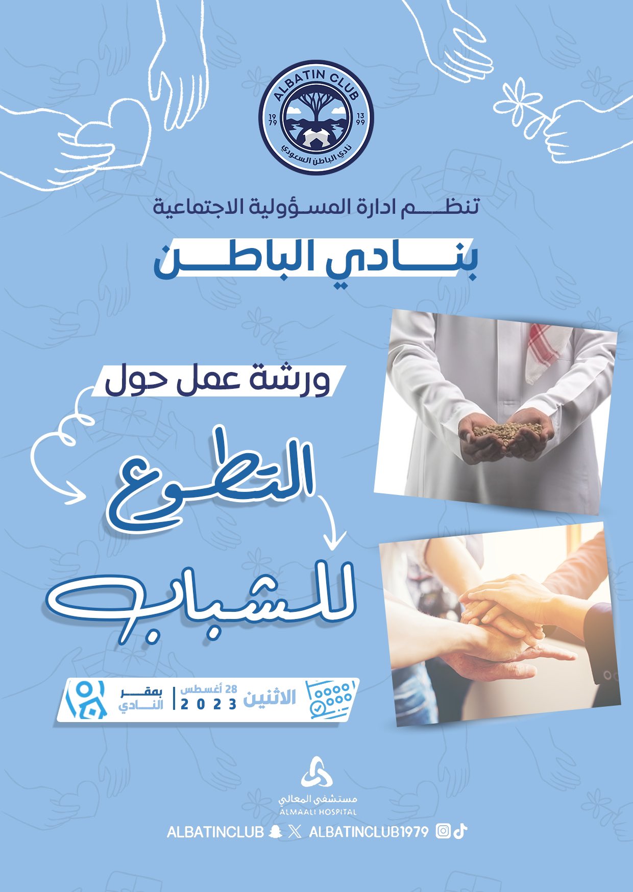 إدارة المسوؤلية الاجتماعية بنادي الباطن تنظم ورشة عمل حول التطوع للشباب 27 أغسطس، 2023 / اخبار النادي, المسؤولية الإجتماعية تنظم إدارة المسؤولية الإجتماعية بنادي #الباطن ورشة عمل حول التطوع للشباب Share via: Facebook X (Twitter) LinkedIn More