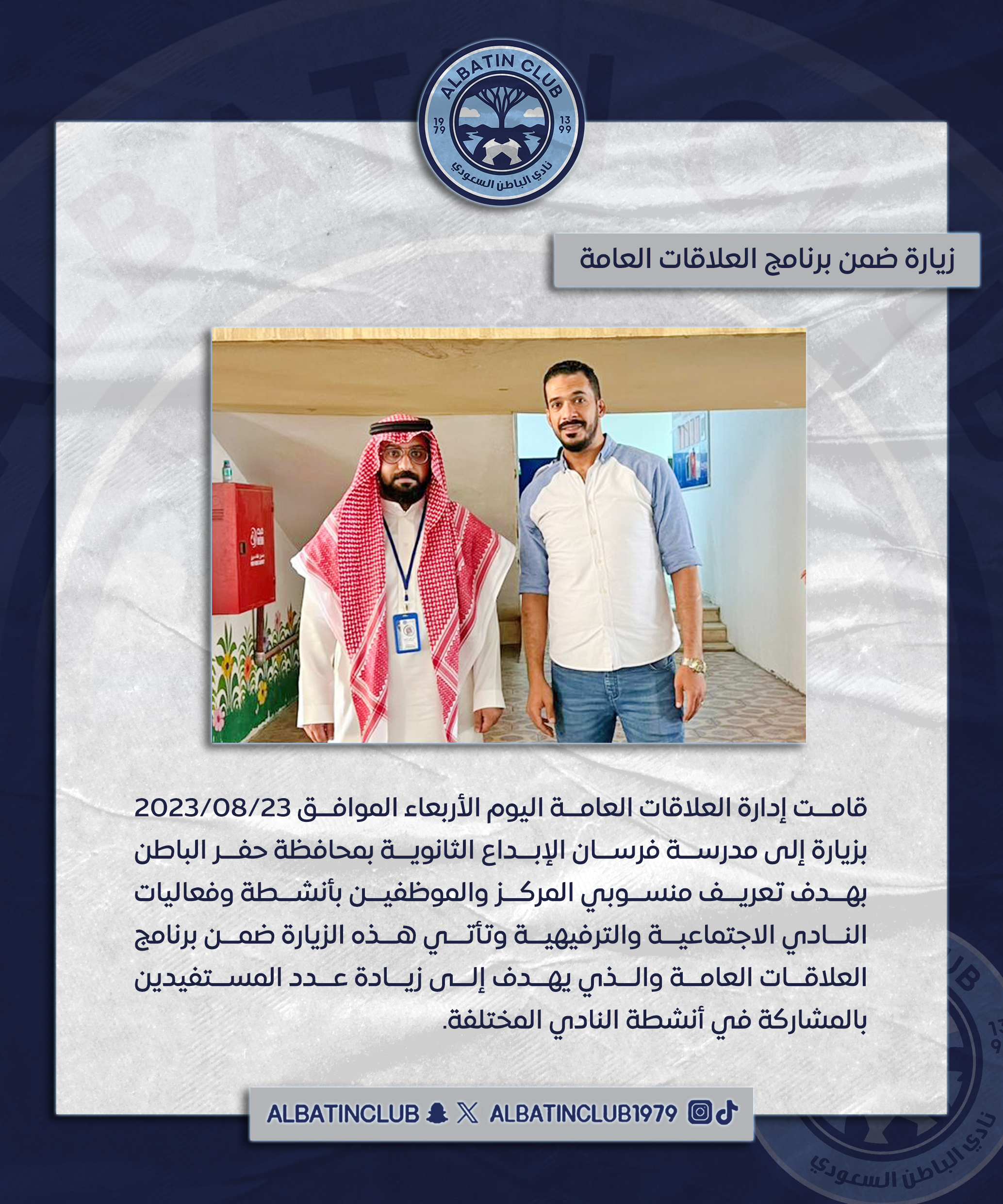 قامت إدارة العلاقات العامة اليوم الأربعاء الموافق 2023/08/23 بزيارة إلى مدرسة فرسان الإبداع الثانوية بمحافظة حفر الباطن بهدف تعريف منسوبي المركز والموظفين بأنشطة وفعاليات النادي الاجتماعية والترفيهية وتأتي هذه الزيارة ضمن برنامج العلاقات العامة والذي يهدف إلى زيادة عدد المستفيدين بالمشاركة في أنشطة النادي المختلفة.