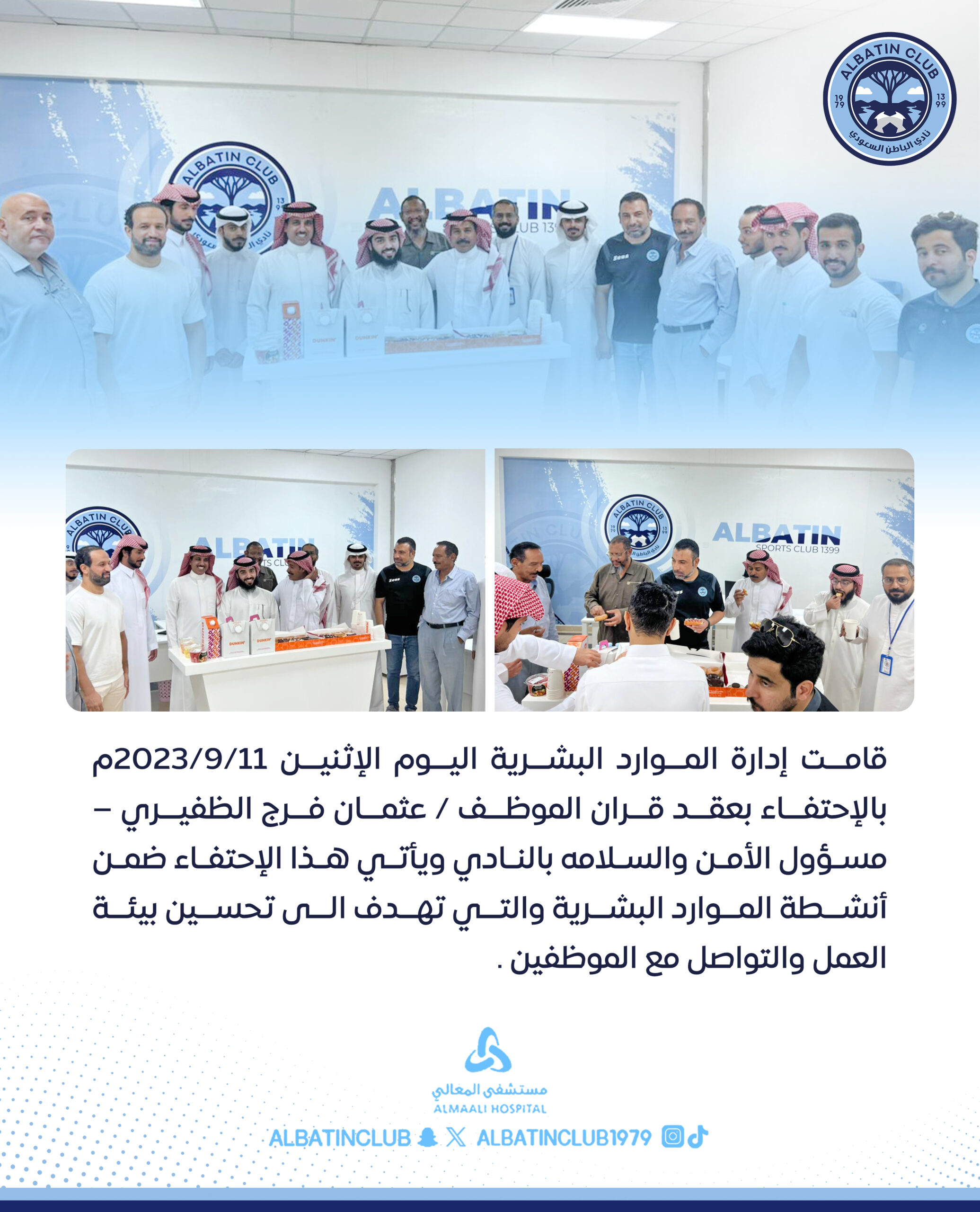 قامت إدارة الموارد البشرية اليوم الإثنين 11/9/2023م بالإحتفاء بعقد قران الموظف / عثمان فرج الظفيري – مسؤول الأمن والسلامه بالنادي ويأتي هذا الإحتفاء ضمن أنشطة الموارد البشرية والتي تهدف الى تحسين بيئة العمل والتواصل مع الموظفين .