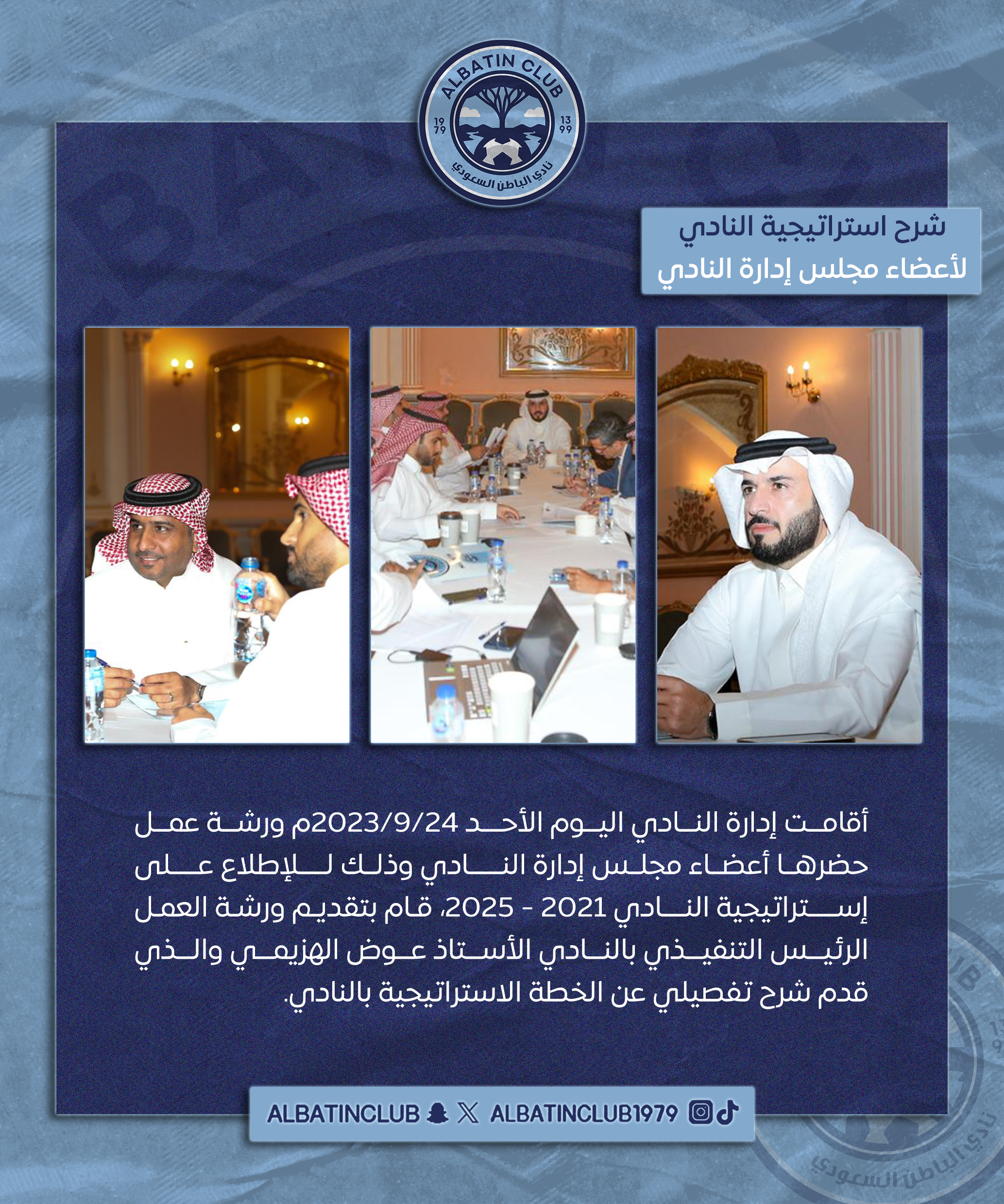 أقامت إدارة النادي اليوم الأحـد 2023/9/24م ورشة عمل حضرها أعضاء مجلس إدارة النــــادي وذلك لـــلإطلاع عـــلى إســــتراتيجية النـــادي 2021 – 2025، قام بتقديم ورشة العمل الرئيس التنفيذي بالنادي الأستاذ عوض الهزيمي والذي قدم شرح تفصيلي عن الخطة الاستراتيجية بالنادي.