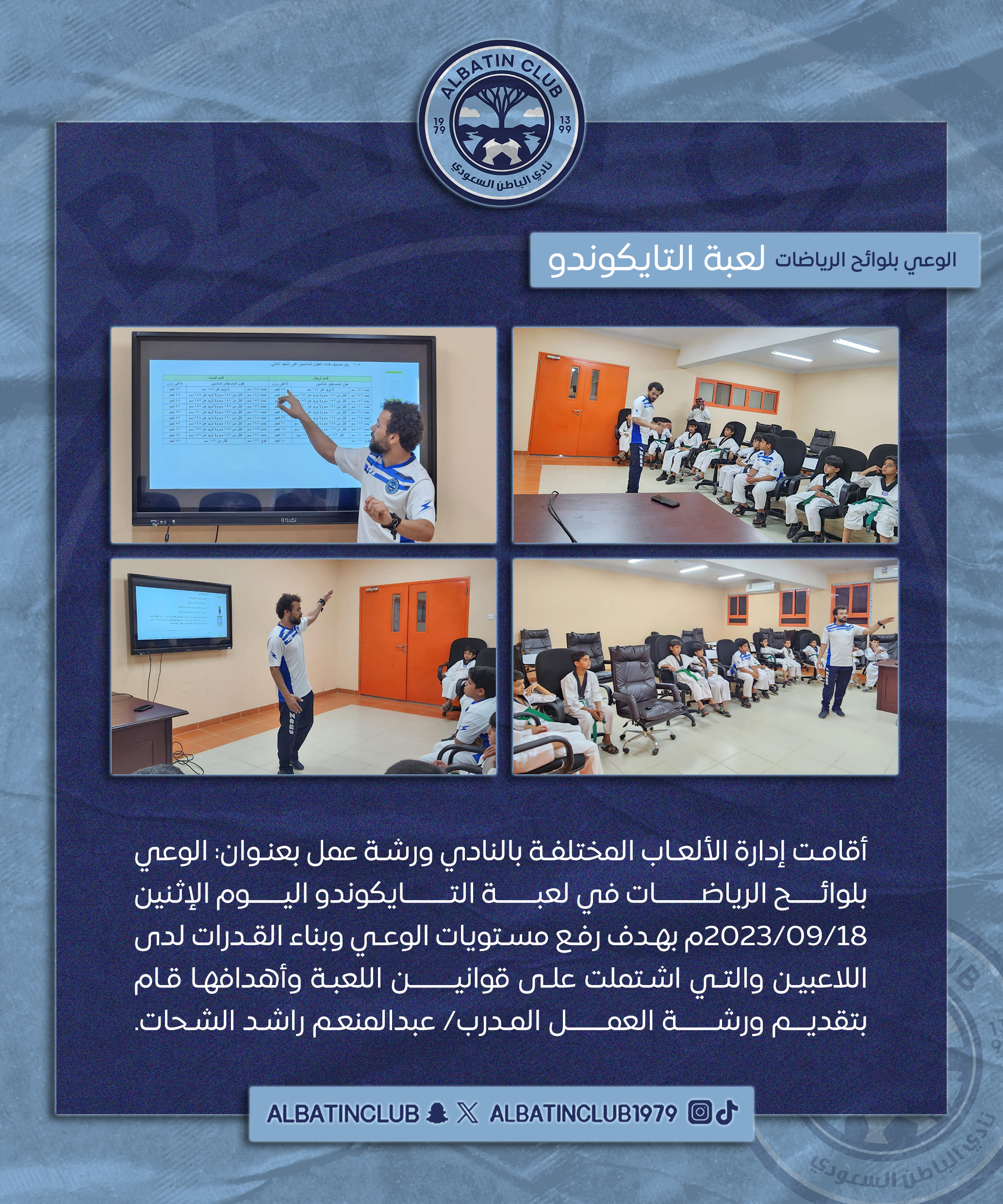 أقامت إدارة الألعاب المختلفة بالنادي ورشة عمل بعنوان: الوعي بلوائــــح الرياضـــــــات في لعبــــــة التـــــــايكوندو اليـــــوم الإثنين 2023/09/18م بهدف رفع مستويات الوعي وبناء القدرات لدى اللاعبين والتي اشتملت على قوانيـــــــن اللعبة وأهدافها قام بتقديــم ورشــــــة العمــــــل المدرب/ عبدالمنعم راشد الشحات.