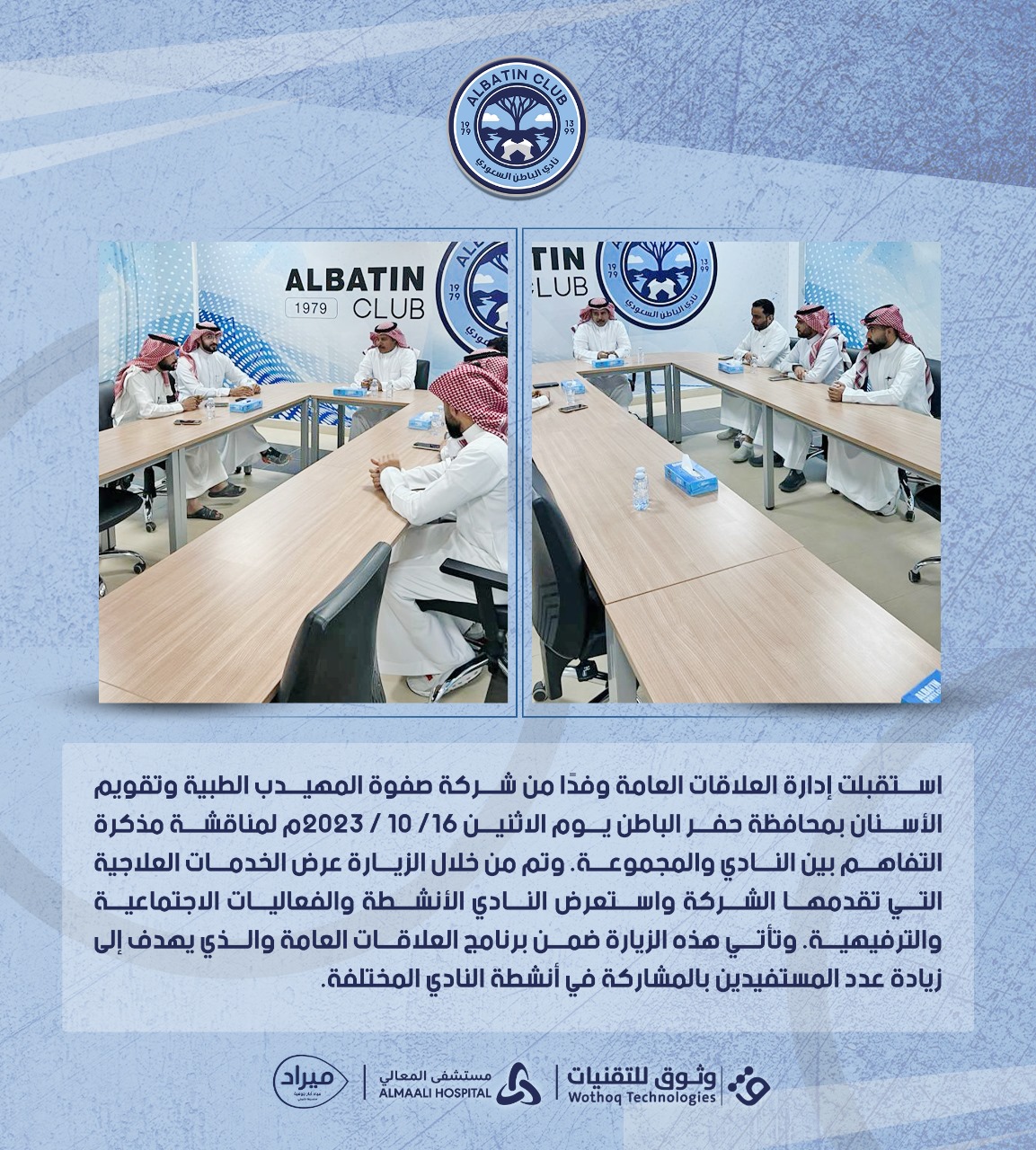 استقبلت إدارة العلاقات العامة وفدًا من شركة صفوة المهيدب الطبية وتقويم الأسنان بمحافظة حفر الباطن يوم الاثنين 16/ 10 / 2023م لمناقشة مذكرة التفاهم بين النادي والمجموعة. وتم من خلال الزيارة عرض الخدمات العلاجية التي تقدمها الشركة واستعرض النادي الأنشطة والفعاليات الاجتماعية والترفيهية. وتأتي هذه الزيارة ضمن برنامج العلاقات العامة والذي يهدف إلى زيادة عدد المستفيدين بالمشاركة في أنشطة النادي المختلفة.