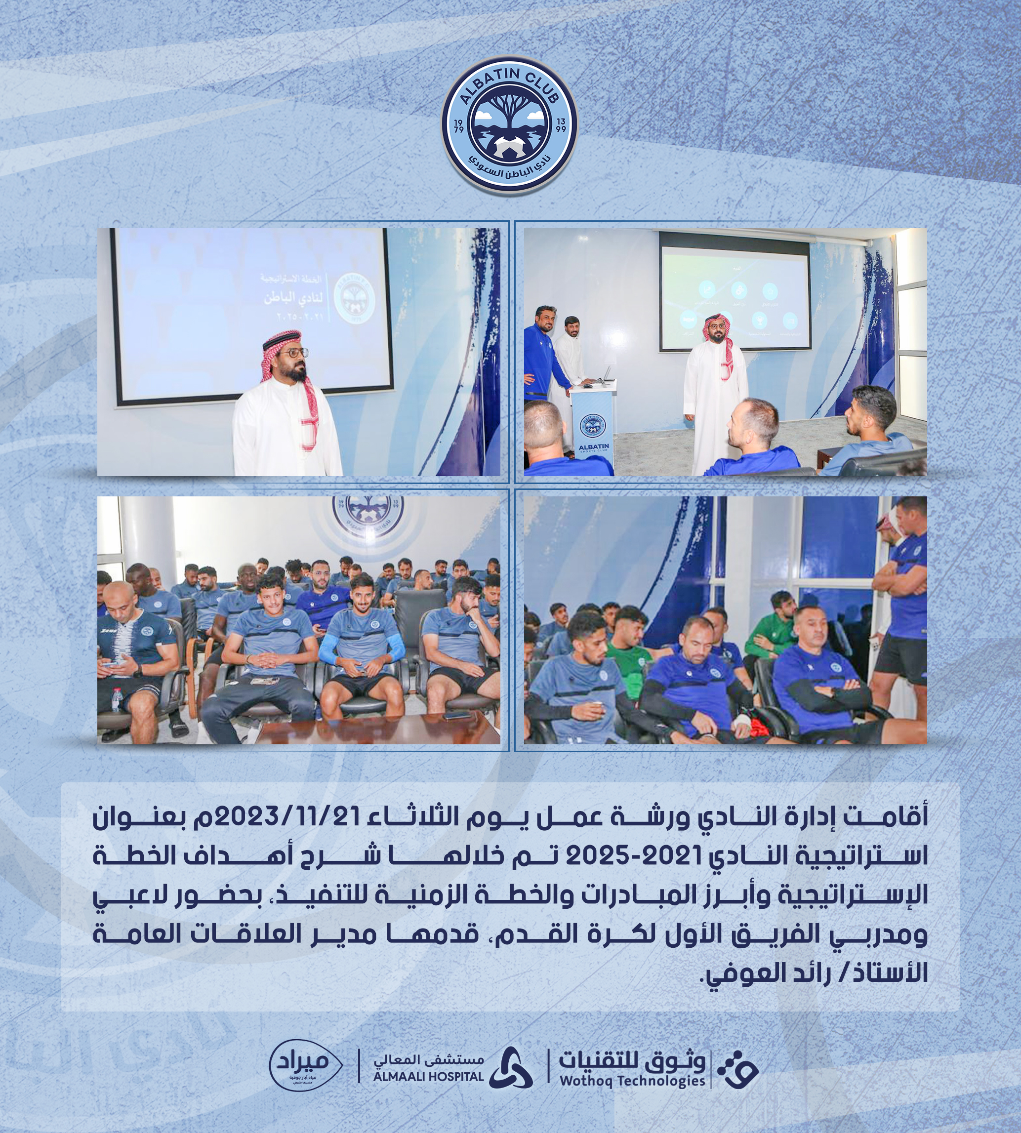 أقامت إدارة النادي ورشة عمل يوم الثلاثاء 2023/11/21م بعنوان استراتيجية النادي 2025-2021 تم خلالهـــــا شـــرح أهـــداف الخطة الإستراتيجية وأبرز المبادرات والخطة الزمنية للتنفيذ، بحضور لاعبي ومدربي الفريق الأول لكرة القدم، قدمها مدير العلاقات العامة الأستاذ/ رائد العوفي.