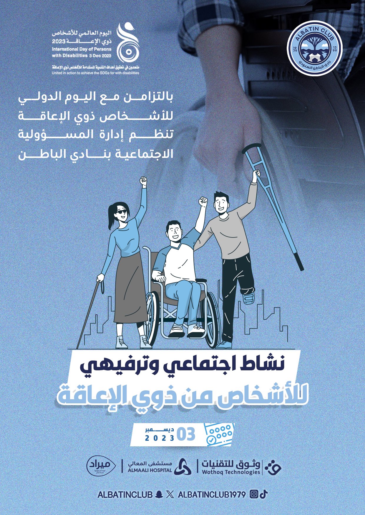 بالتزامن مع اليوم الدولي للأشخاص ذوي الإعاقة تحرص إدارة المسؤولية الإجتماعية بنادي الباطن على تنظيم نشاط إجتماعي وترفيهي للأشخاص من ذوي الإعاقة يوم 3 ديسمبر 2023م.