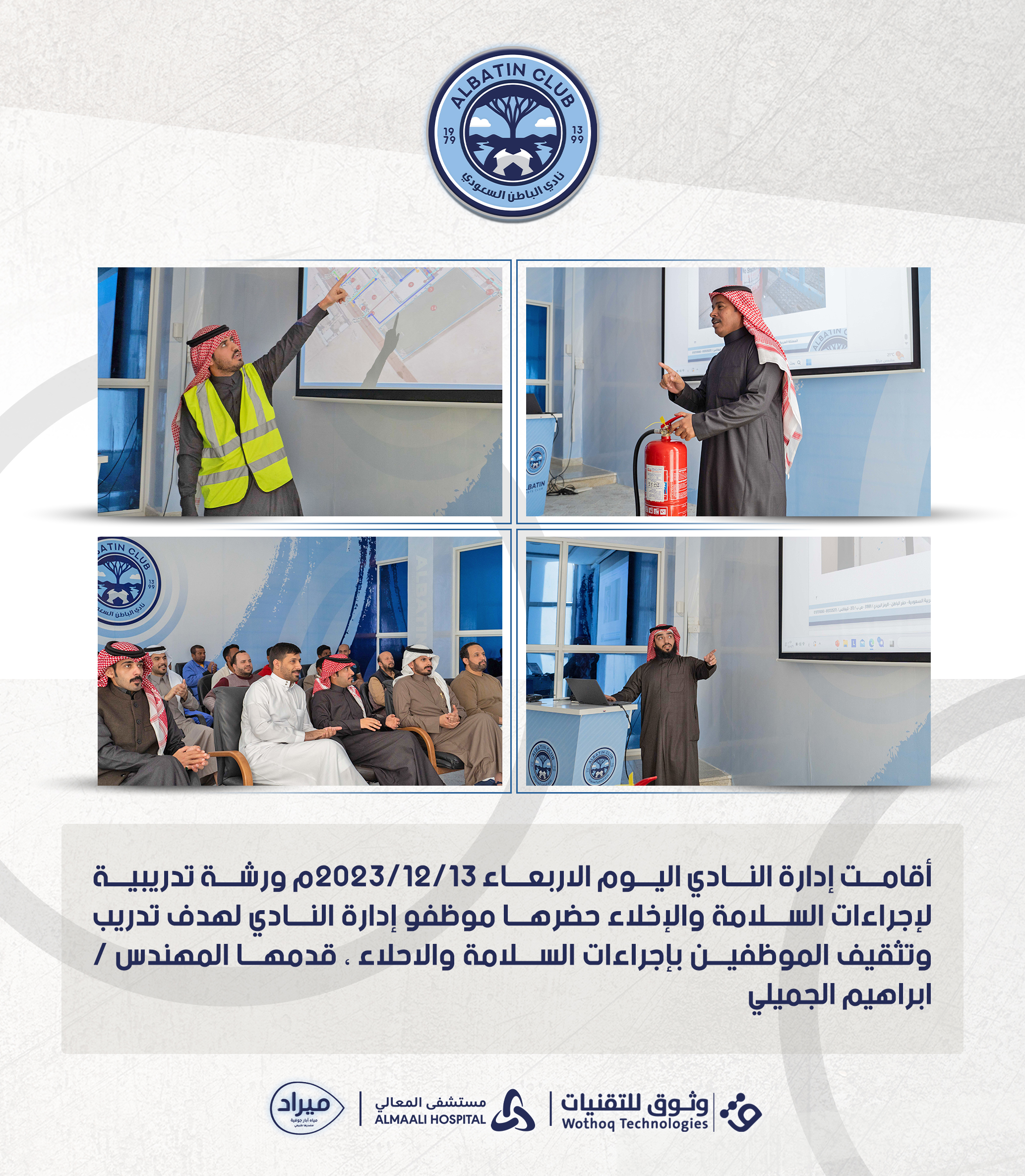 أقامت إدارة النادي اليوم الاربعاء 13/12/2023م ورشة تدريبية لإجراءات السلامة والإخلاء حضرها موظفو إدارة النادي لهدف تدريب وتثقيف الموظفين بإجراءات السلامة والاحلاء ، قدمها المهندس / ابراهيم الجميلي