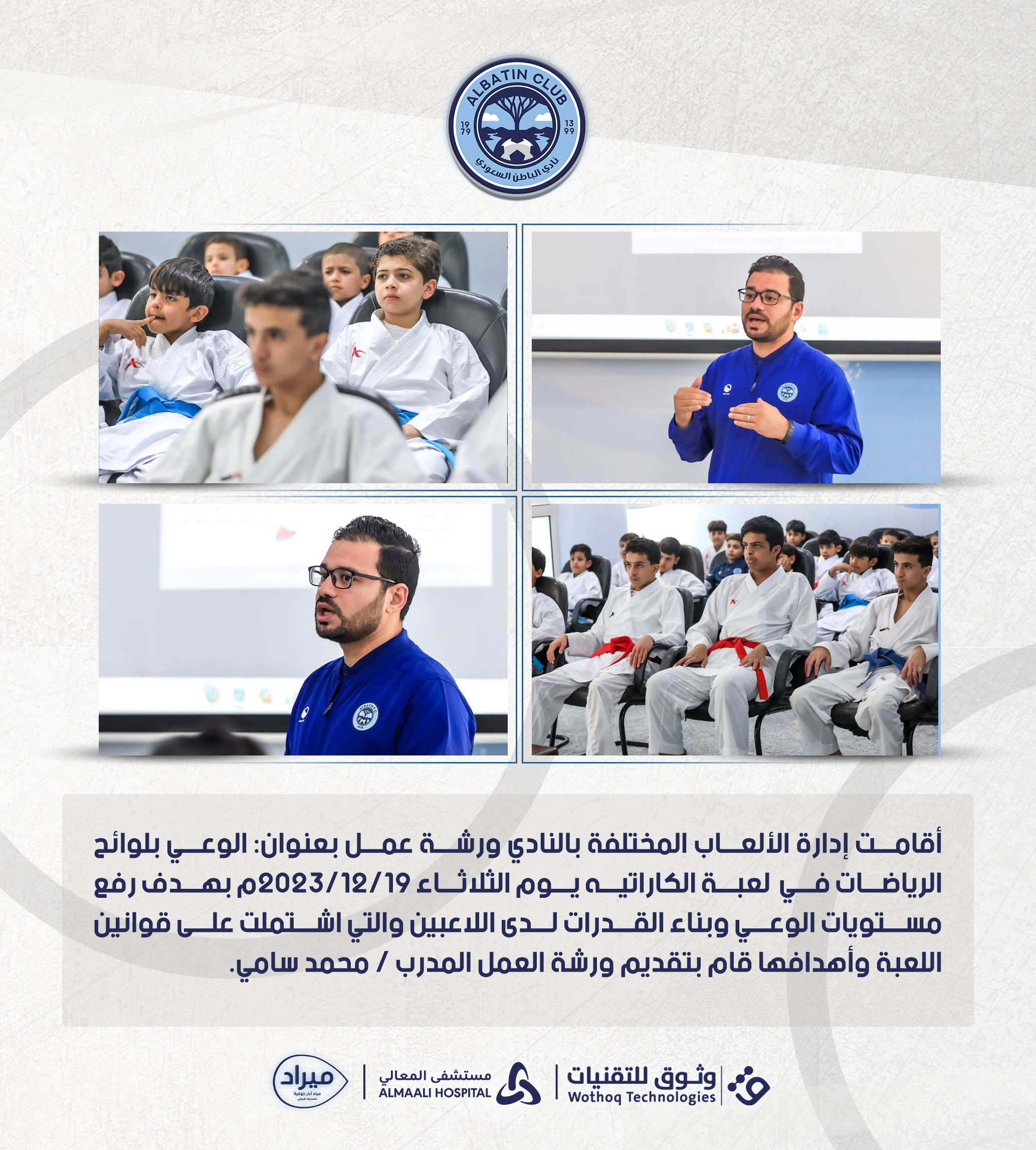 أقامت إدارة الألعاب المختلفة بالنادي ورشة عمل بعنوان: الوعي بلوائح الرياضات في لعبة الكاراتيه يوم الثلاثاء 2023/12/19م بهدف رفع مستويات الوعي وبناء القدرات لدى اللاعبين والتي اشتملت على قوانين اللعبة وأهدافها قام بتقديم ورشة العمل المدرب / محمد سامي.