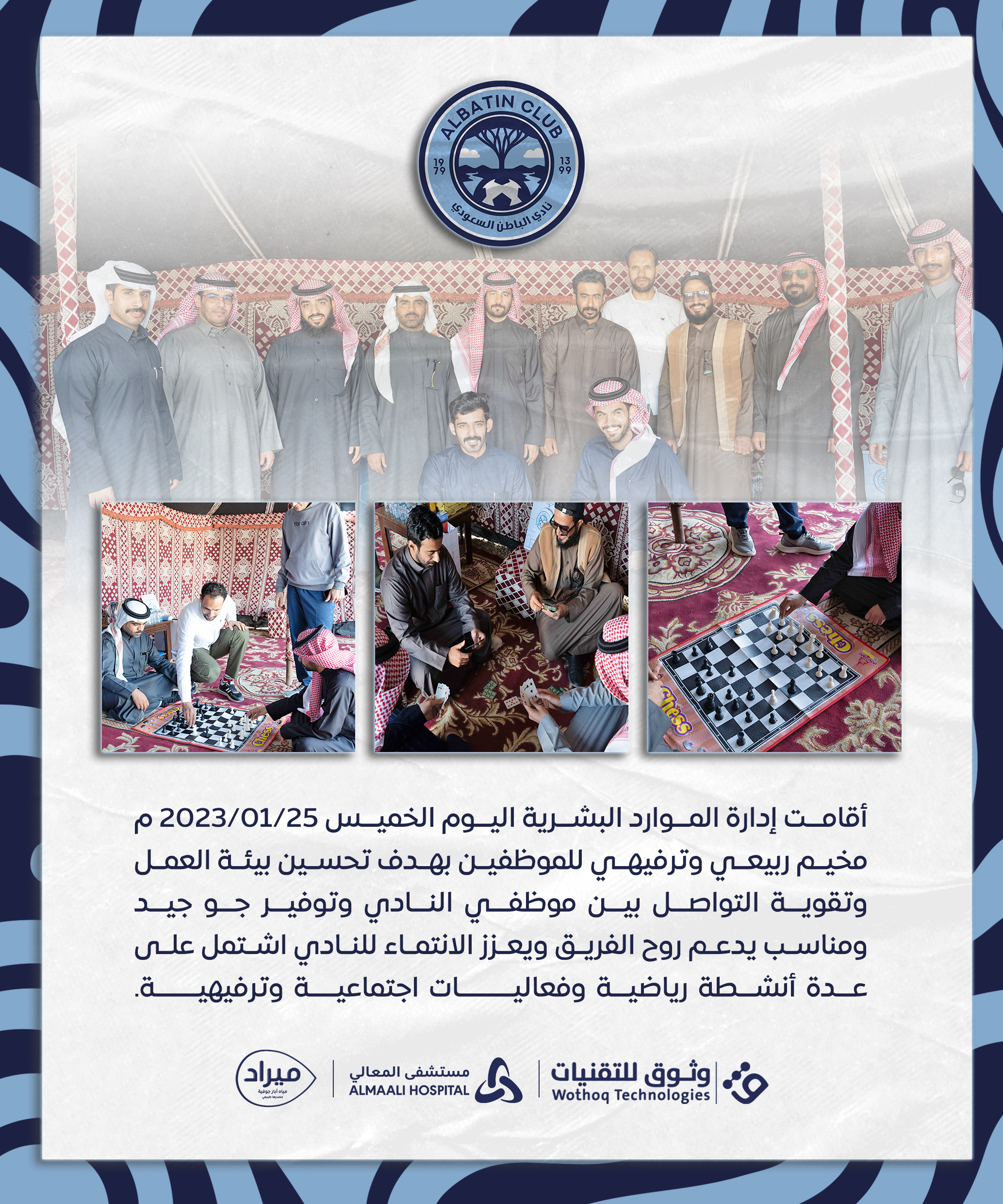 أقامت إدارة الموارد البشرية اليوم الخميس 25/01/2023 م مخيم ربيعي وترفيهي للموظفين بهدف تحسين بيئة العمل وتقوية التواصل بين موظفي النادي وتوفير جو جيد ومناسب يدعم روح الفريق ويعزز الانتماء للنادي اشتمل على عدة أنشطة رياضية وفعاليـــــــات اجتماعيــة وترفيهيـــــة.