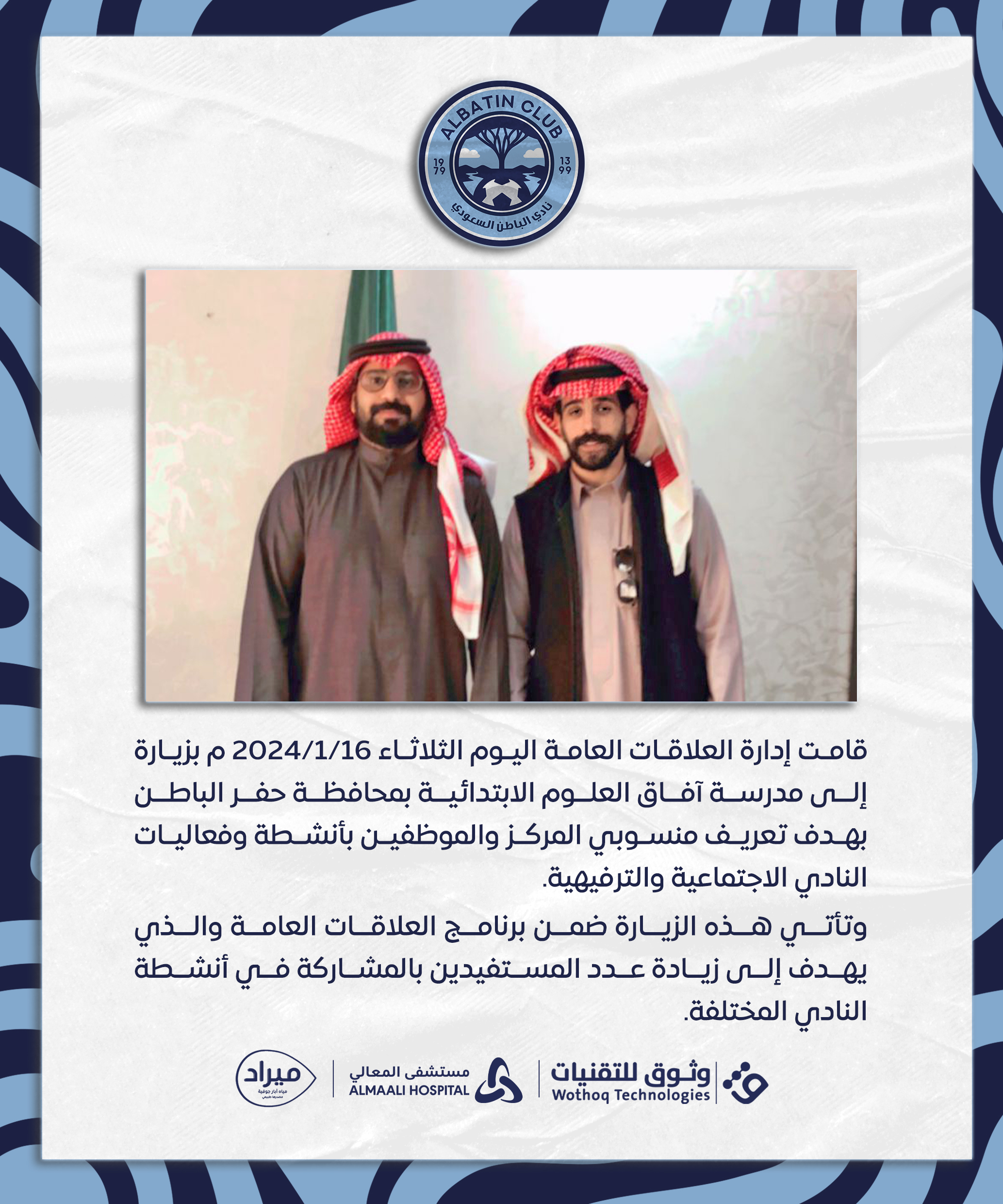 قامت إدارة العلاقات العامة اليوم الثلاثاء 16/1/2024 م بزيارة إلى مدرسة آفاق العلوم الابتدائية بمحافظة حفر الباطن بهدف تعريف منسوبي المركز والموظفين بأنشطة وفعاليات النادي الاجتماعية والترفيهية.