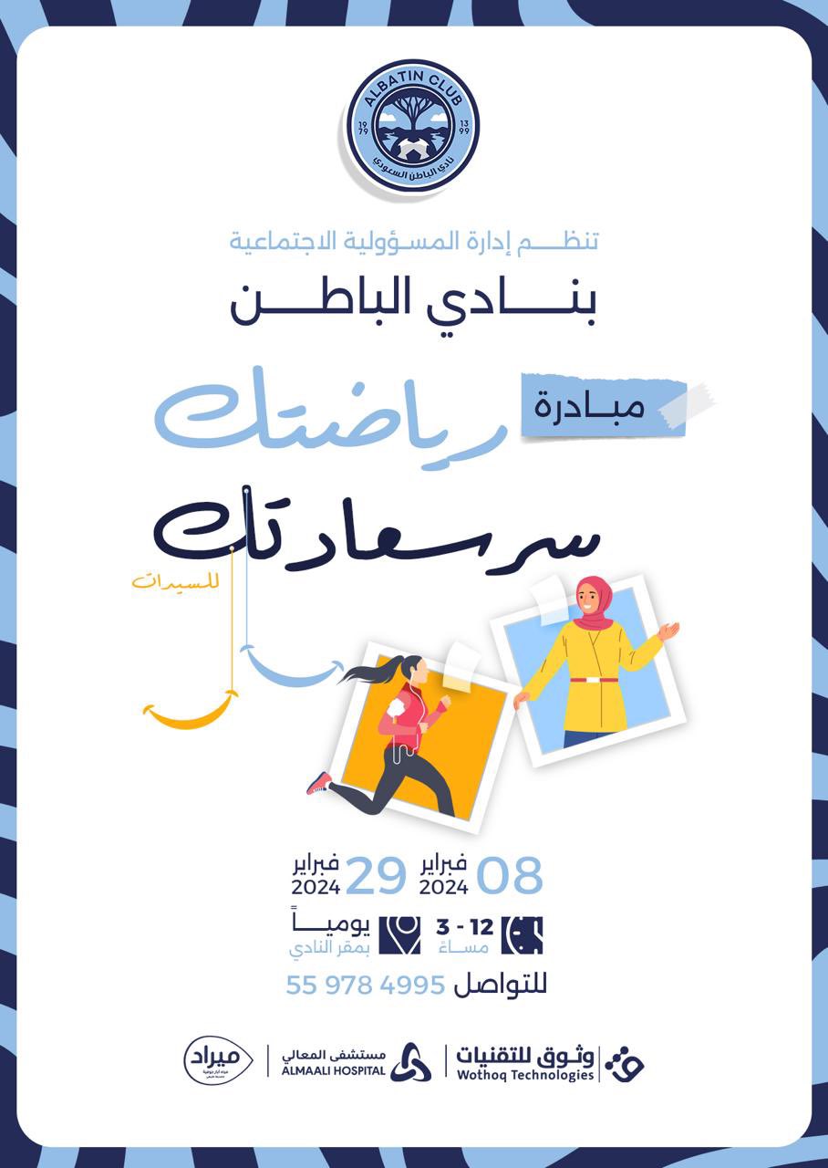 حرصاً من إدارة المسؤولية الاجتماعية بالنادي على توسيع قاعدة الممارسة الرياضية بين فئات المجتمع، سوف يتم تنظيم فعاليات رياضية للسيدات خلال الفترة من 8 – 29 فبراير، يسعدنا حضوركم .