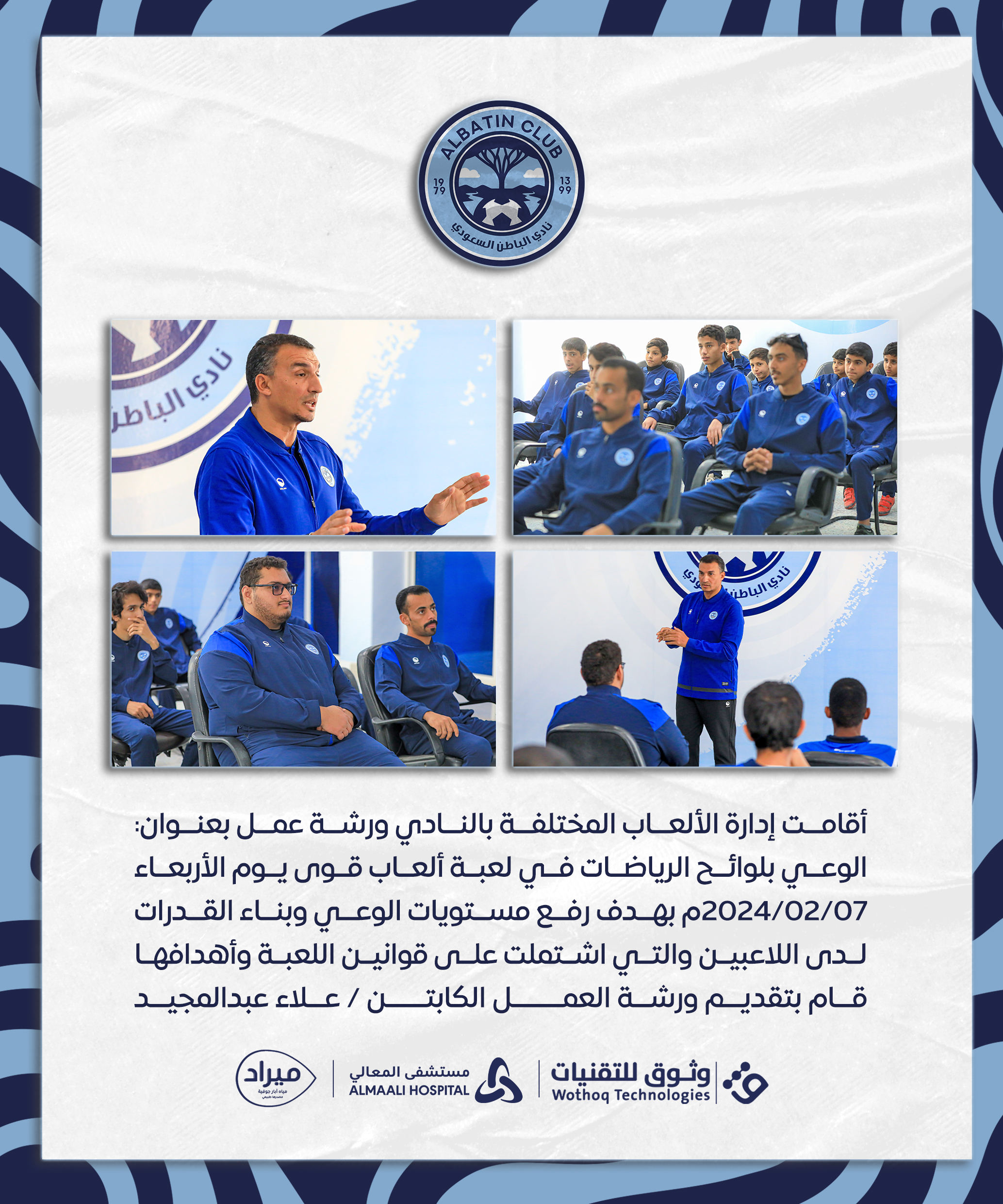 أقامت إدارة الألعاب المختلفة بالنادي ورشة عمل بعنوان: الوعي بلوائح الرياضات في لعبة ألعاب قوى يوم الأربعاء 2024/02/07م بهدف رفع مستويات الوعي وبناء القدرات لدى اللاعبين والتي اشتملت على قوانين اللعبة وأهدافها قام بتقديم ورشة العمــــــل الكابتــــن / علاء عبدالمجيد