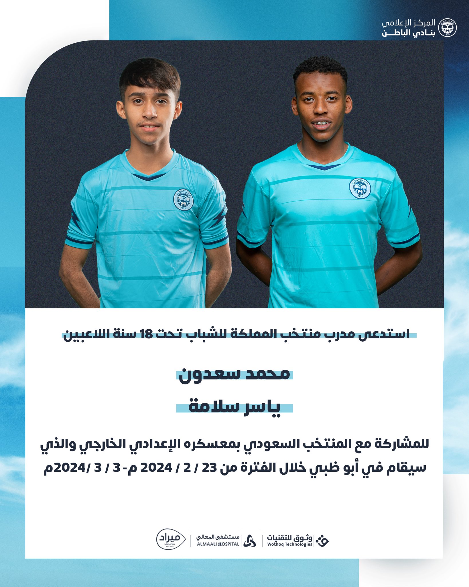 مدرب منتخب الشباب تحت 18 سنة يستدعي لاعبيّ الباطن 12 فبراير، 2024 / اخبار النادي, الفئات السنية, المسؤولية الإجتماعية مدرب منتخب الشباب تحت 18 سنة يستدعي لاعبيّ #الباطن ( محمد سعدون ، ياسر سلامة ) للإنضمام لمعسكر المنتخب Share via: Facebook X (Twitter) LinkedIn More