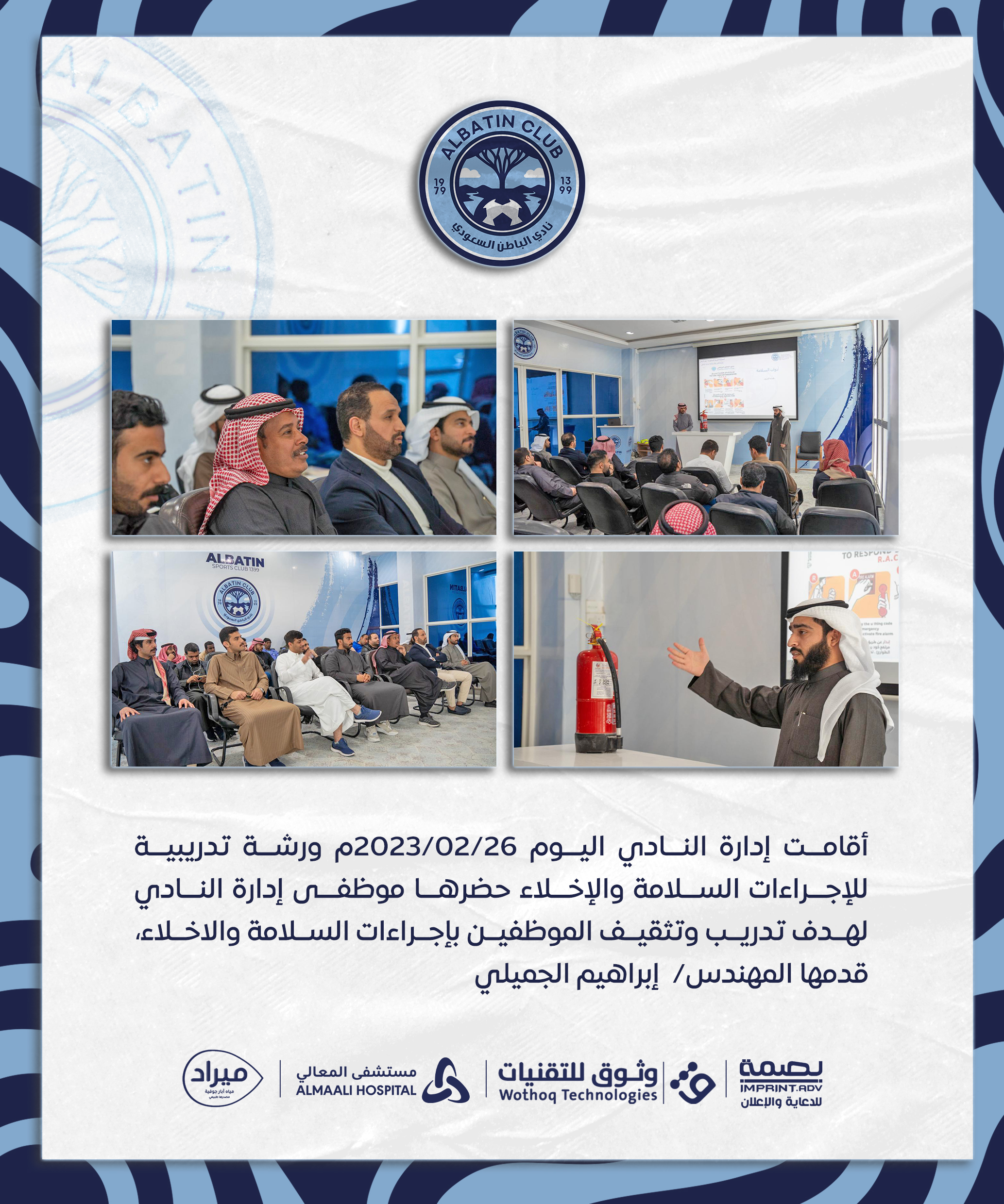أقامت إدارة النادي اليوم 26/02/2023م ورشة تدريبية للإجراءات السلامة والإخلاء حضرها موظفى إدارة النادي لهدف تدريب وتثقيف الموظفين بإجراءات السلامة والاخلاء، قدمها المهندس/ إبراهيم الجميلي
