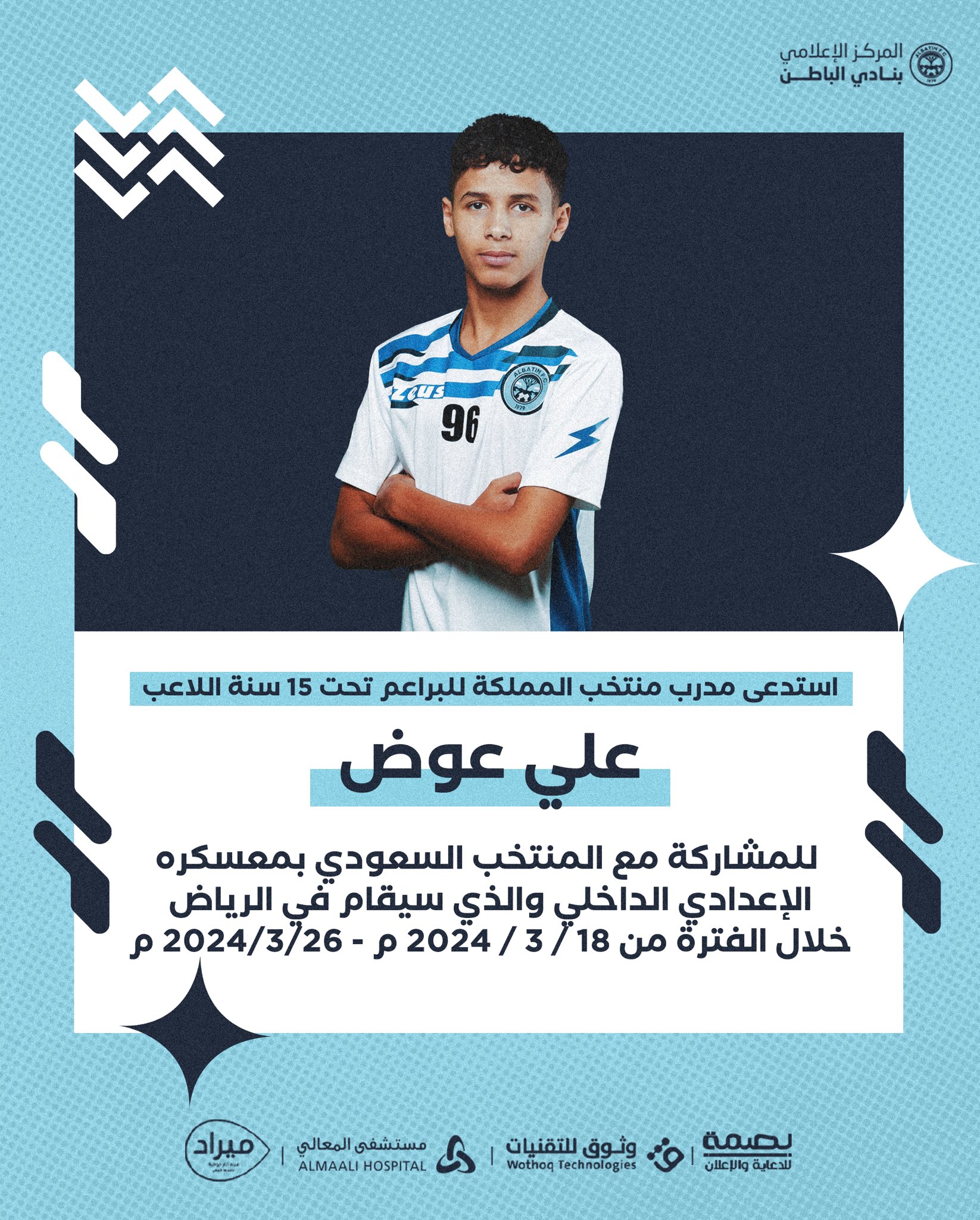 مدرب منتخب البراعم تحت 15 سنة يستدعي لاعب الباطن علي عوض للإنضمام لمعسكر المنتخب 13 مارس، 2024 / اخبار النادي, الالعاب المختلفة, الفئات السنية Share via: Facebook X (Twitter) LinkedIn More