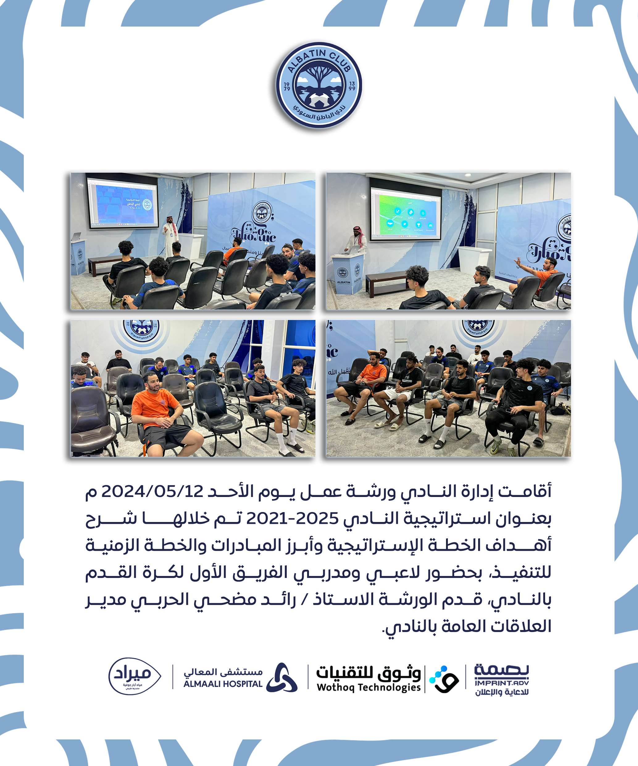أقامت إدارة النادي ورشة عمل يوم الأحد 12/05/2024 م بعنوان استراتيجية النادي 2025-2021 تم خلالهـــــا شـــرح أهـــداف الخطة الإستراتيجية وأبرز المبادرات والخطة الزمنية للتنفيذ، بحضور لاعبي ومدربي الفريق الأول لكرة القدم بالنادي، قدم الورشة الاستاذ / رائد مضحي الحربي مدير العلاقات العامة بالنادي.