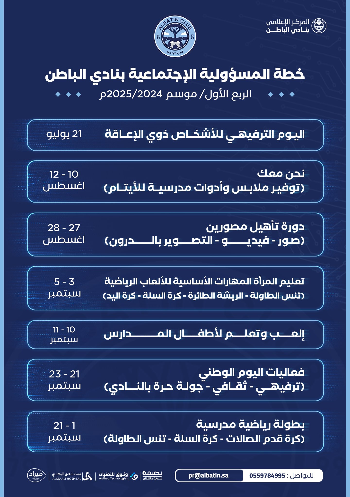 خطة عمل المسؤولية الاجتماعية بنادي الباطن للربع الأول موسم 2024 – 2025 مشاركتكم تسعدنا 7 يوليو، 2024 / اخبار النادي, الفعاليات, المسؤولية الإجتماعية Share via: Facebook X (Twitter) LinkedIn More