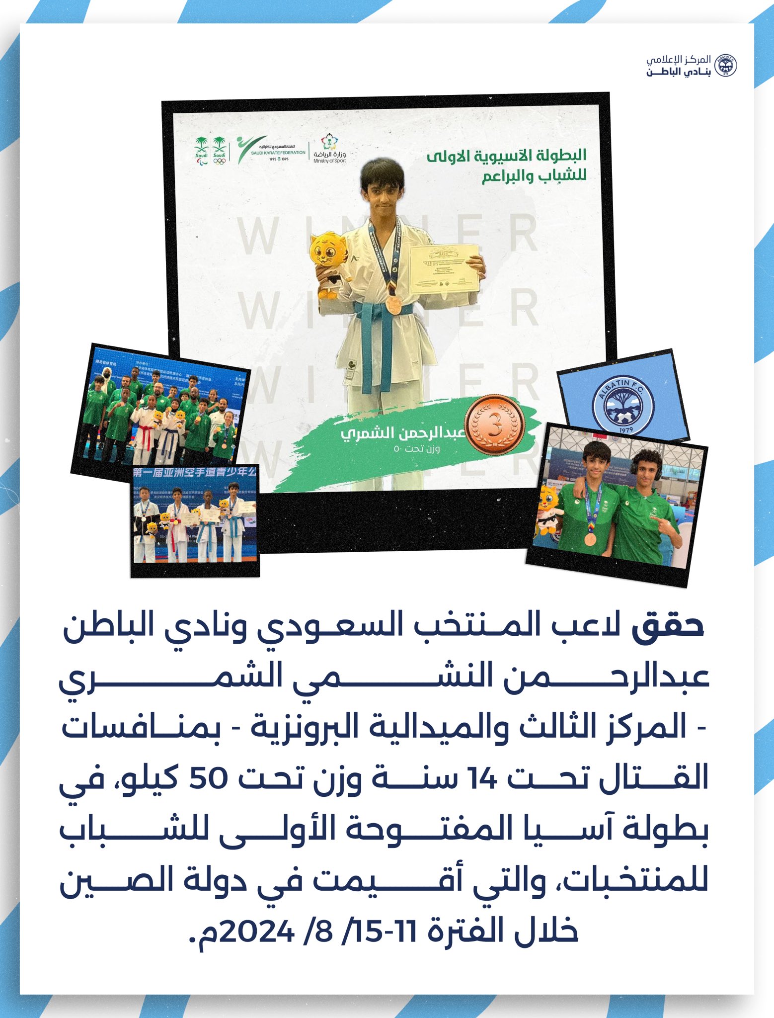 عبدالرحمن الشمري يتمكن من تحقيق الميدالية البرونزية في مسابقة القتال ضمن بطولة آسيا المفتوحة الأولى المخصصة للشباب والتي تضم المنتخبات الوطنية. هذه البطولة تعتبر واحدة من أبرز الفعاليات الرياضية التي تجمع الشباب من مختلف الدول الآسيوية للتنافس في هذا المجال.