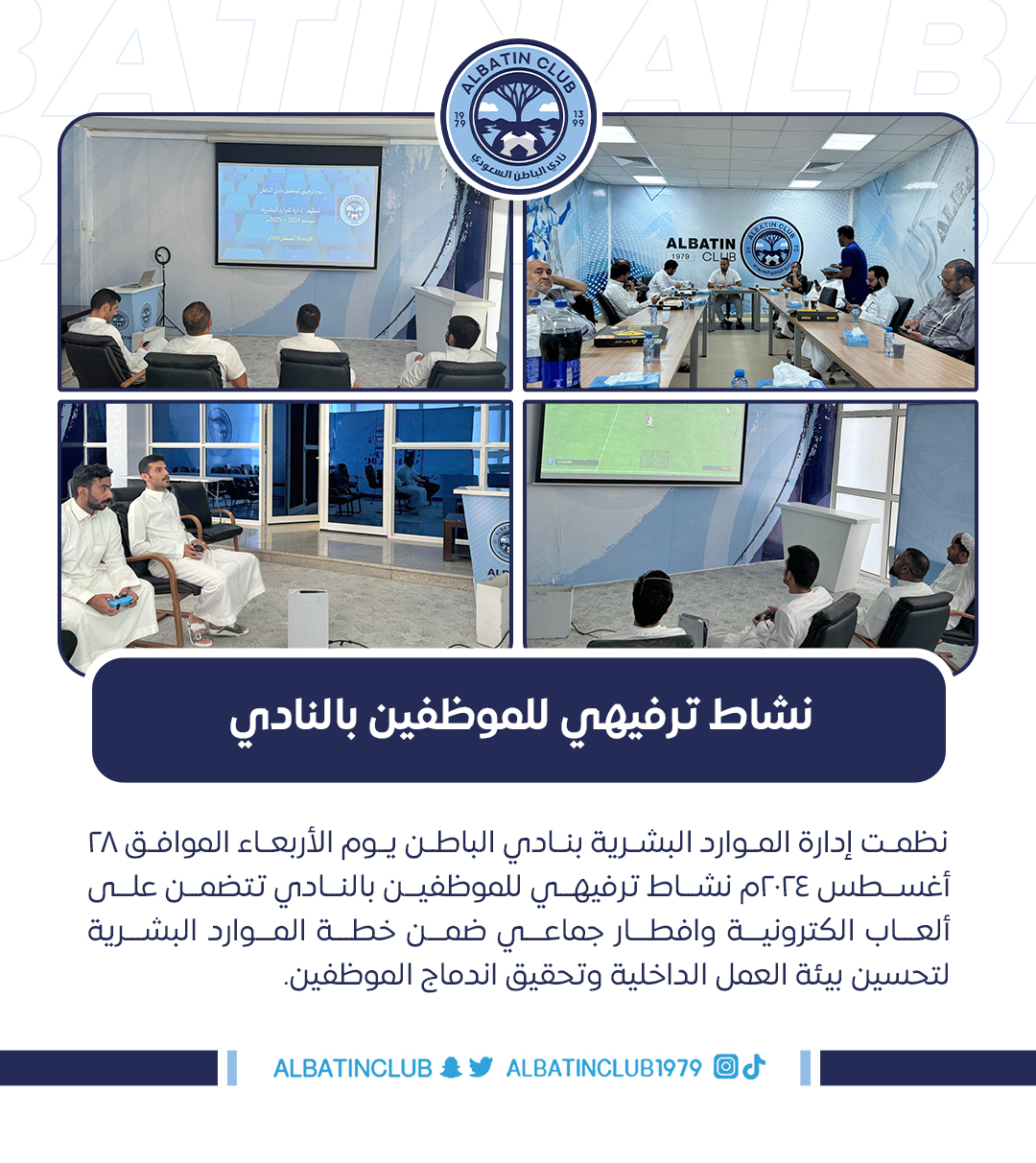 نظمت إدارة الموارد البشرية بنادي الباطن يوم الأربعاء الموافق 28 أغسطس 2024م نشاط ترفيهي للموظفين بالنادي تتضمن على ألعاب الكترونية وافطار جماعي ضمن خطة الموارد البشرية لتحسين بيئة العمل الداخلية وتحقيق اندماج الموظفين.